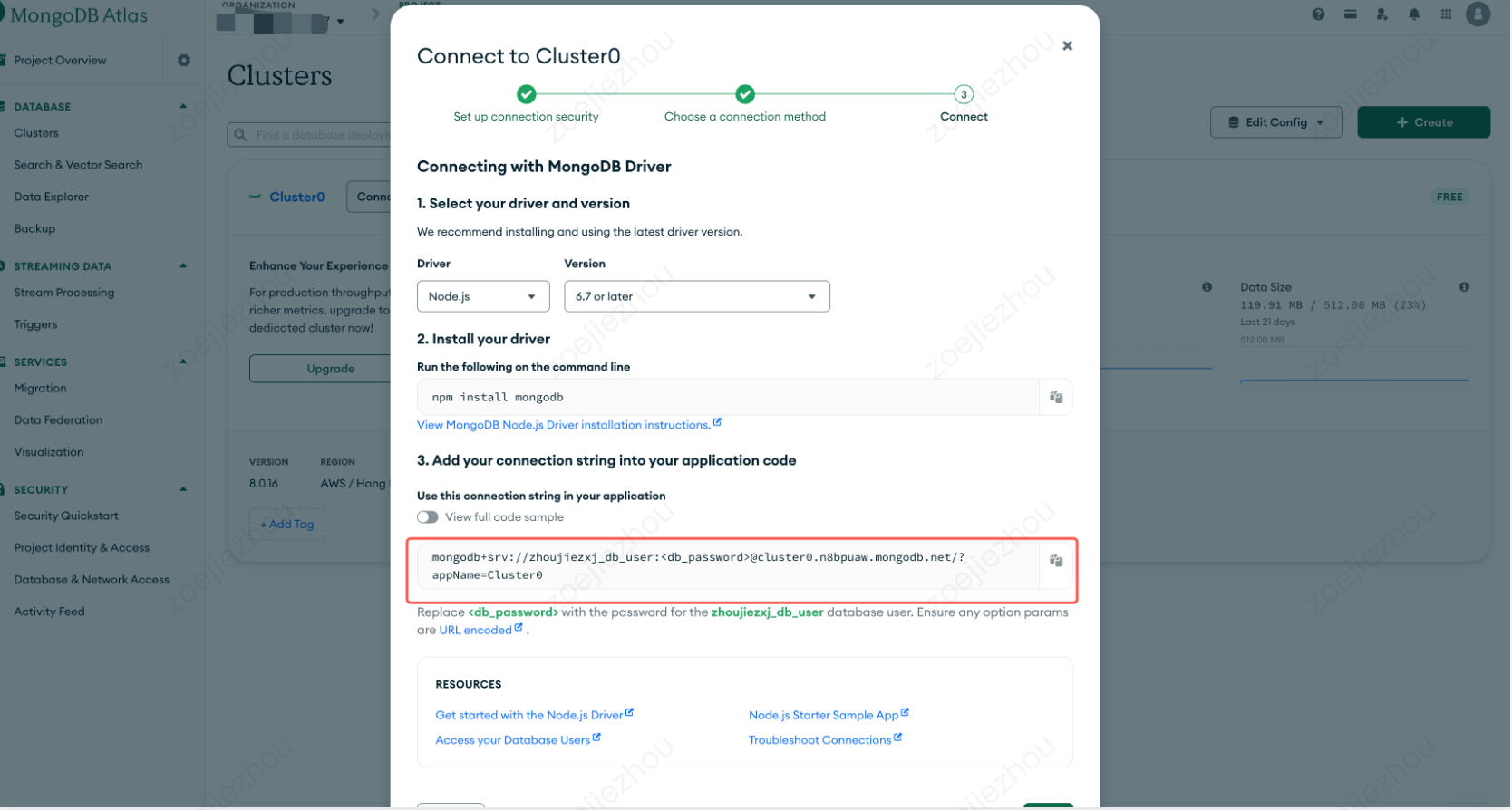 复制提供的 Connection String(通常以 mongodb+srv:// 开头)。