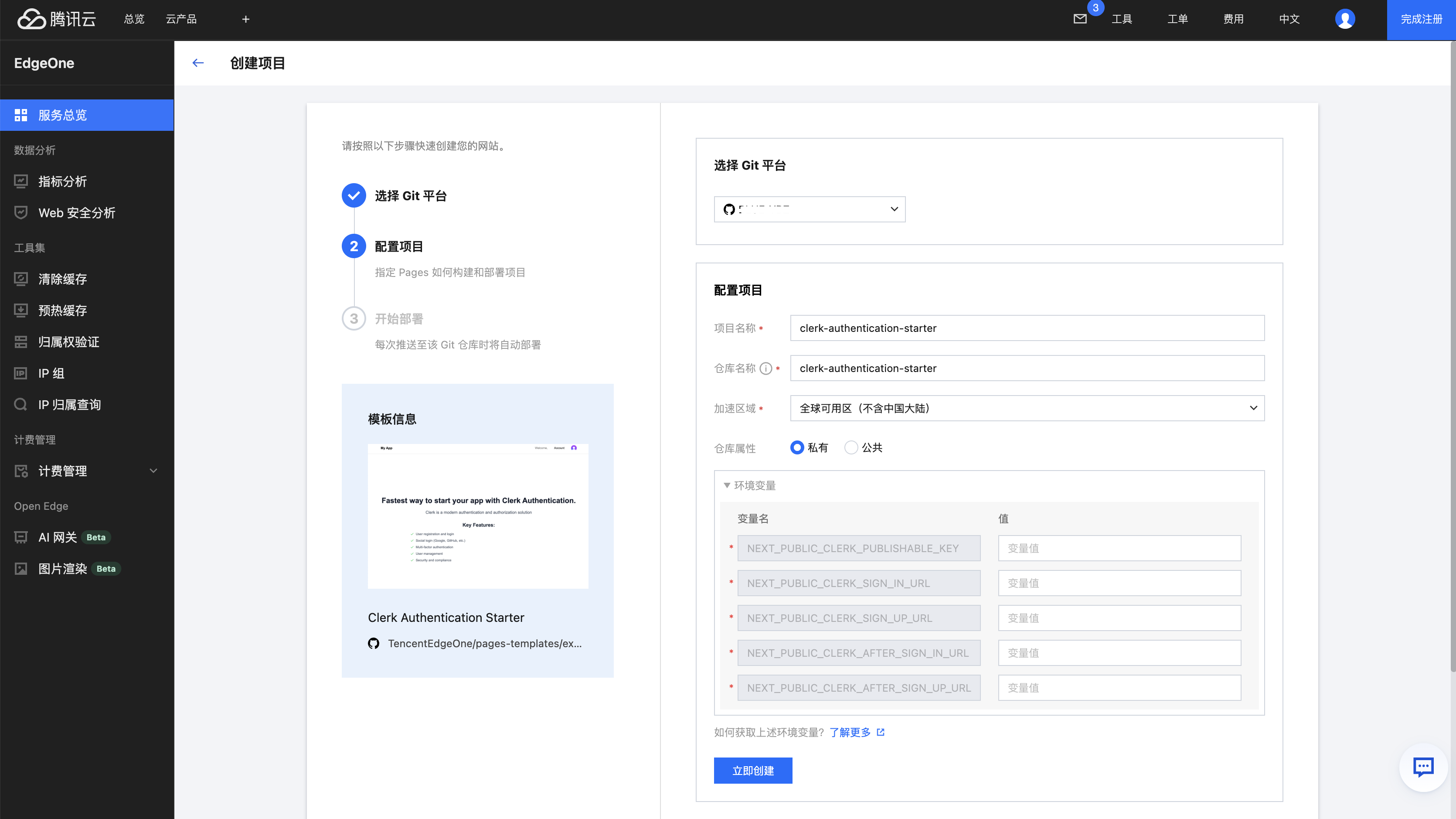 您可以选择 Pages 提供的 Clerk 集成模板,快捷迅速进入到开发当中,点击 Clerk Authentication Starter 模板。本教程大致分为三步:Clerk 配置、本地集成、EdgeOne Pages 部署配置,下面将详细介绍每个步骤的具体操作。