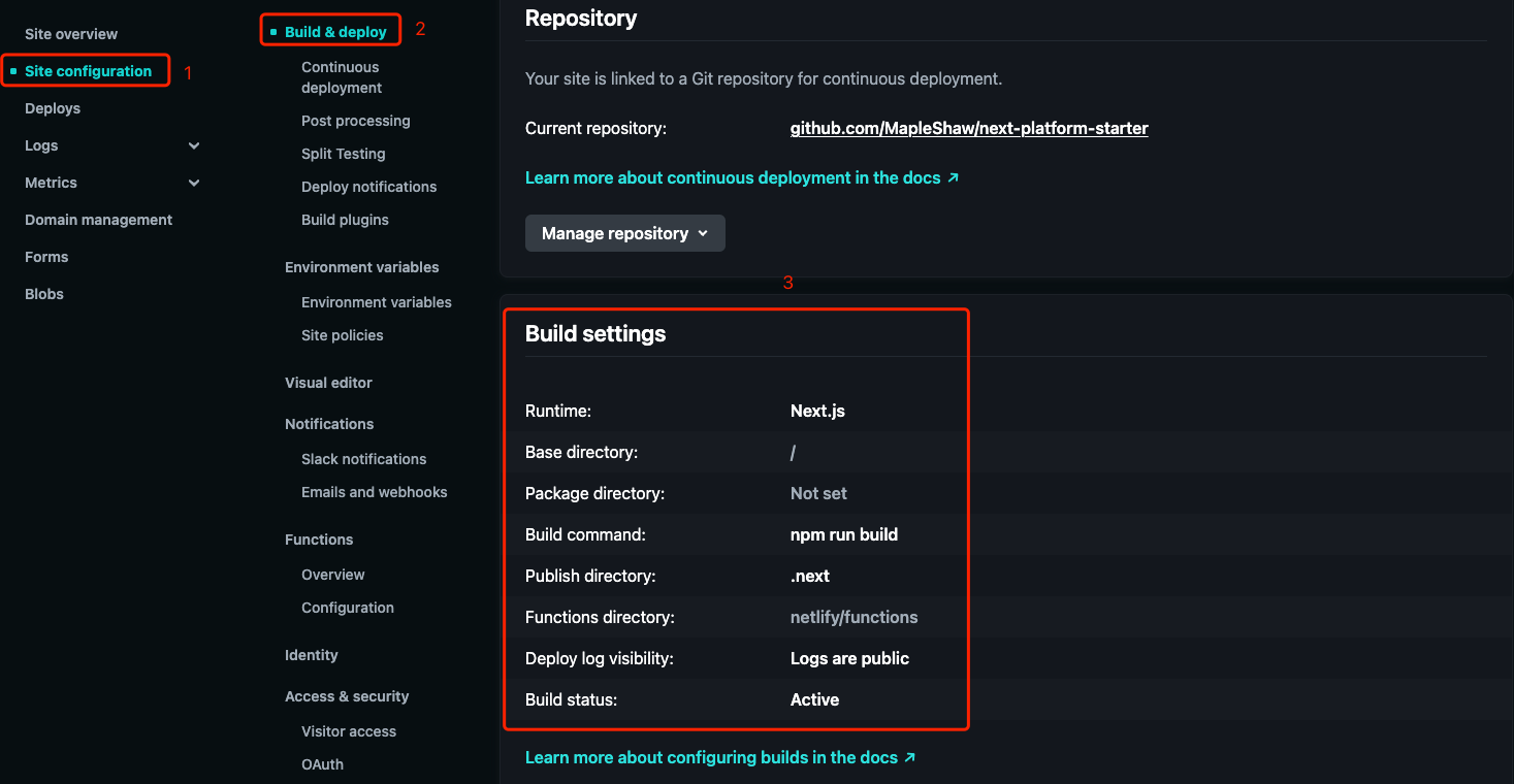 进入 Site configuration(站点配置),选择 Build & deploy(构建与部署)选项。在 Build settings(构建设置)部分,记录 Build command (构建命令)和 Publish directory(发布目录)的值。
