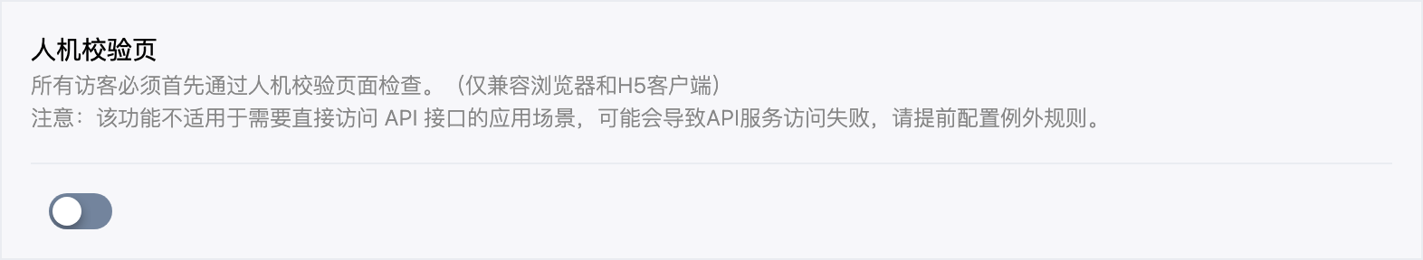 若您的站点存在不兼容的部署场景,直接启用人机校验页可能导致服务中断。