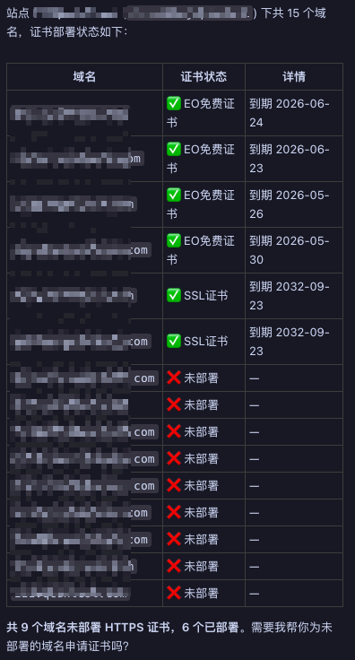 所有涉及变更的操作(创建站点、刷新缓存、修改安全规则等)在执行前均会展示操作内容并等待确认后执行。