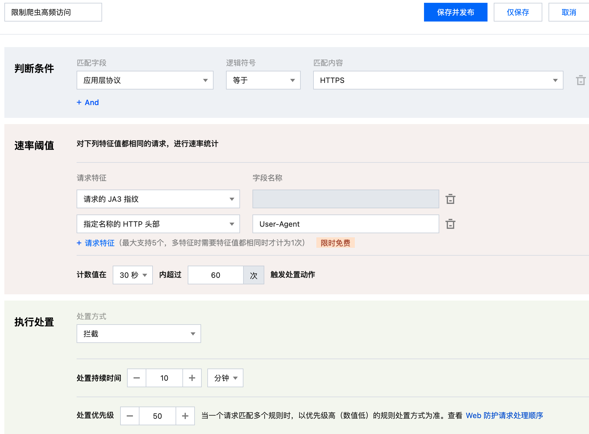 HTTPS,请求特征中 JA3 指纹和 HTTP 头部中的 User-Agent 特征相同的客户端,速率阈值为计数周期 30 秒内,计数超过 60 次时触发。触发后,执行动作为拦截,处置持续时间为 10 分钟。