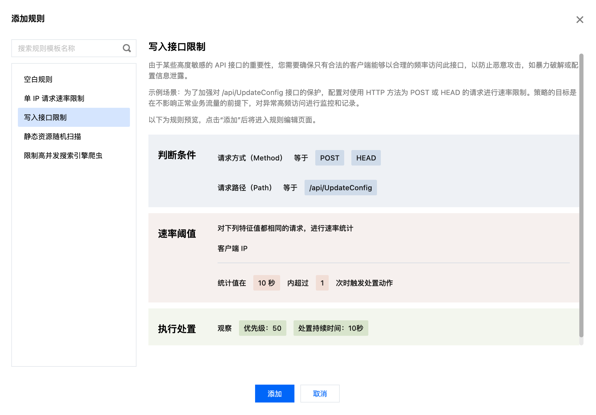 4. 进入添加规则页面,选择写入接口限制规则模板,单击添加。