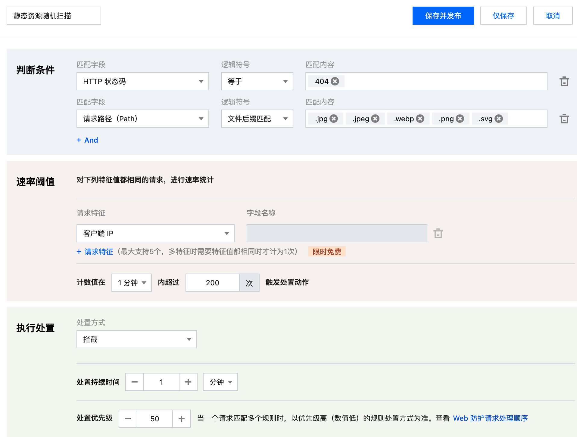 404且请求路径(Path)的文件后缀匹配内容为.jpg .jpeg .webp .png .svg的请求。调整速率阈值为计数周期 1 分钟内,计数超过 200 次时触发。调整触发后执行动作为拦截,处置持续时间为 1 分钟。