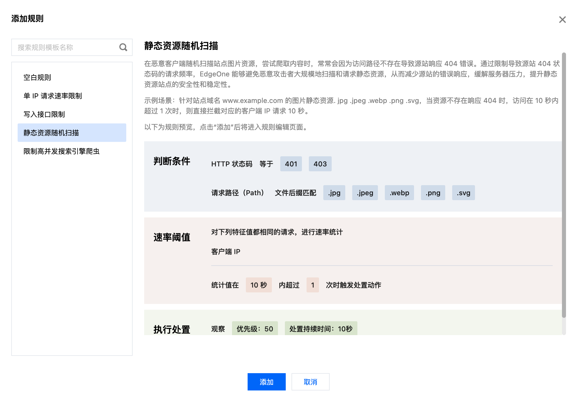 4. 进入添加规则页面,选择静态资源随机扫描规则模板,单击添加。