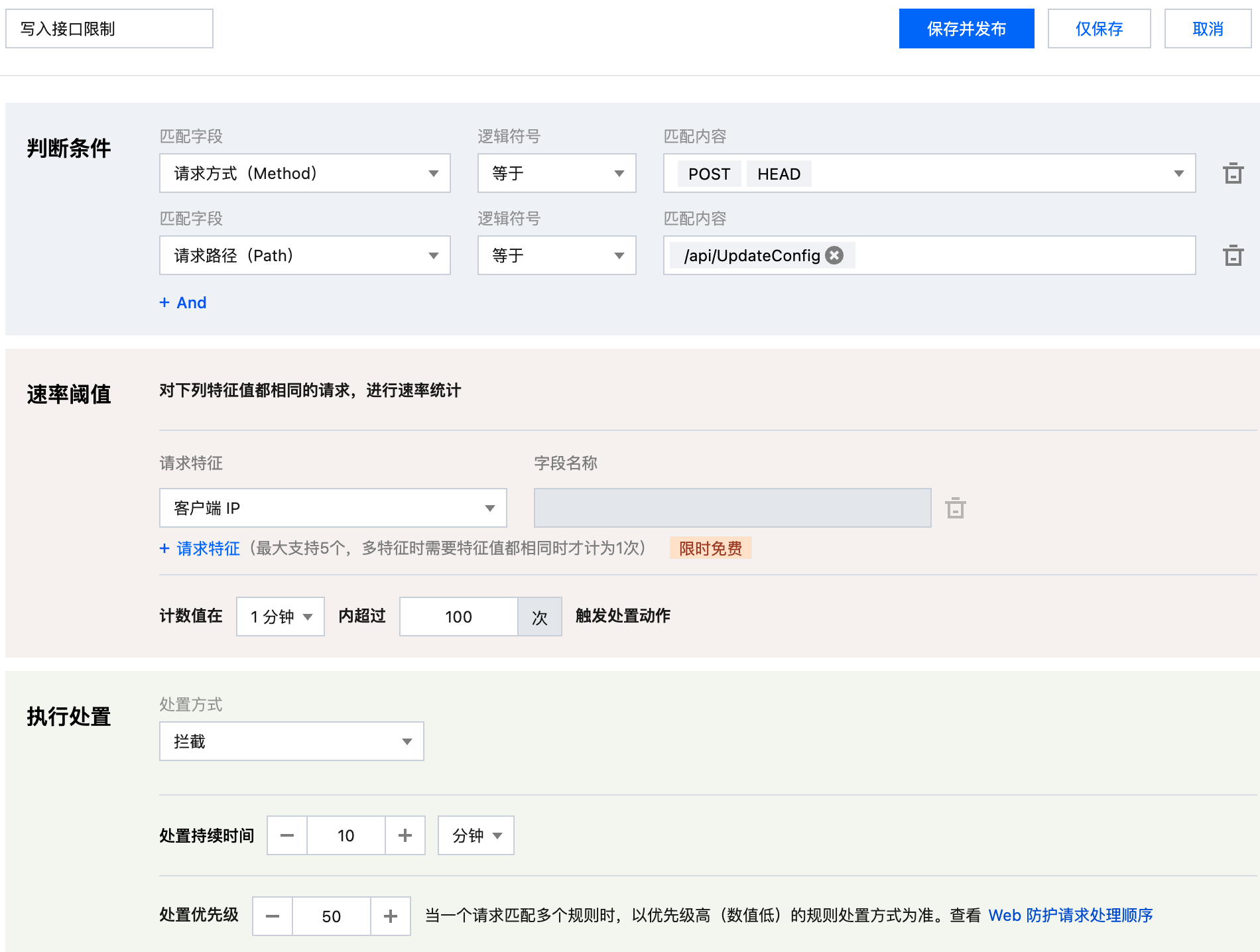 POST HEAD且请求路径(Path)等于/api/UpdateConfig,调整速率阈值为计数周期 1 分钟内,计数超过 100 次时触发。调整触发后执行动作为拦截,处置持续时间为 10 分钟。