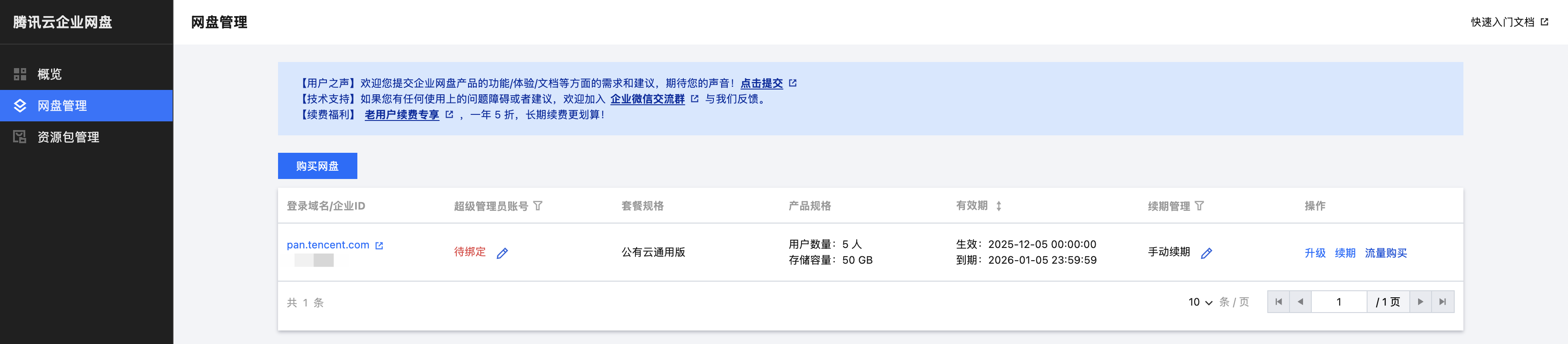 购买企业网盘:具体操作步骤请参见 购买方式。