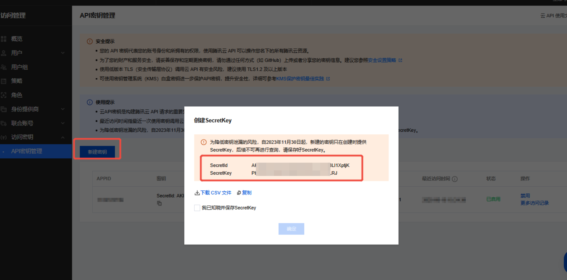 密钥是指:SecretId 和 SecretKey ,为降低密钥泄露的风险,自2023年11月30日起,对所有主账号、子账号的密钥,关闭查询 SecretKey 的功能,仅支持在创建时查看,请及时保存 SecretKey 。如果忘记 SecretKey ,可以删除密钥之后重新创建一个。