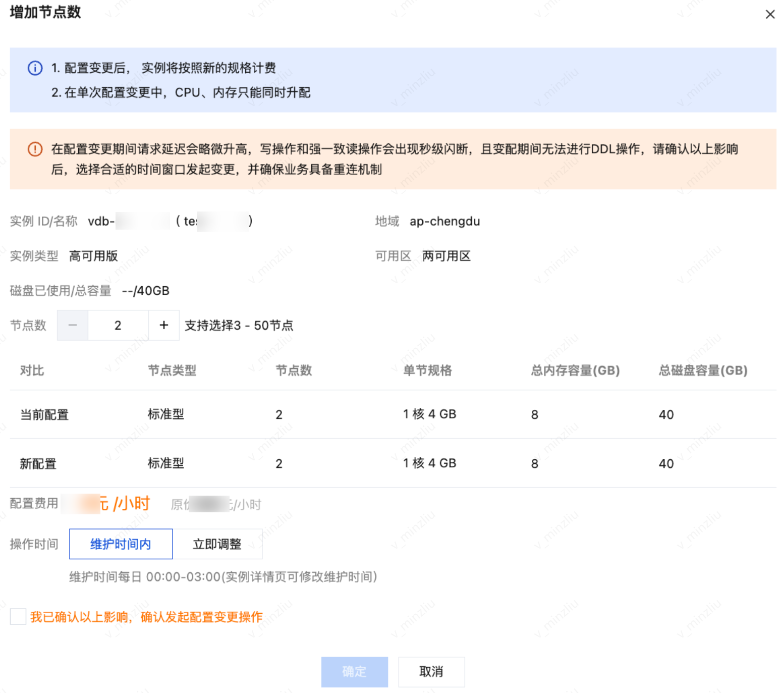 操作时间 | 维护时间内:指在下一个维护时间段内执行增加节点数的任务。实例列表中“状态”列将显示“待执行配置变更”,等到维护时间窗时,启动扩容任务。维护时间的更多信息,请参见 维护时间窗。 立即调整:立即执行增加节点数量的任务。请确保此时没有重大业务操作。 |