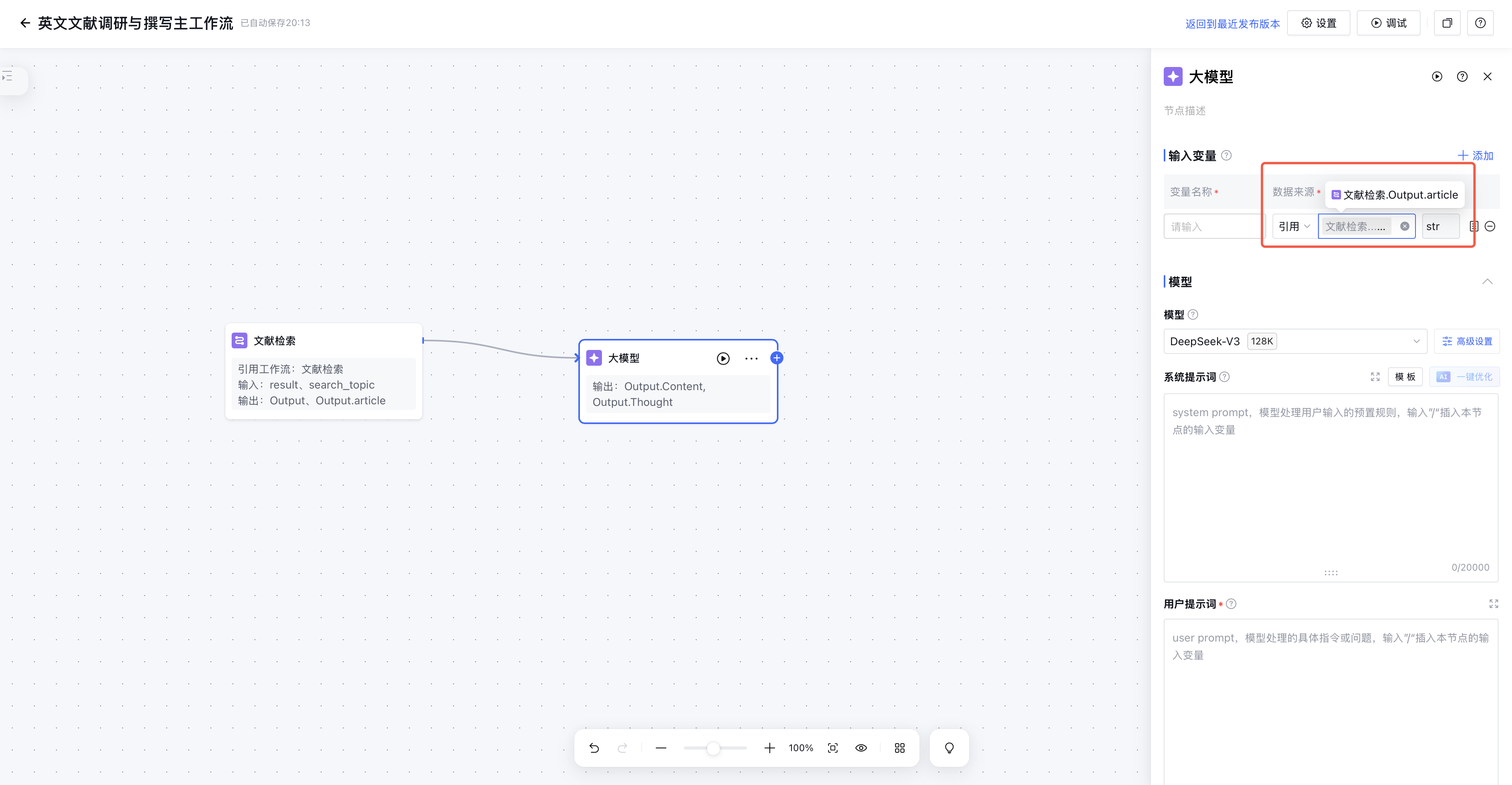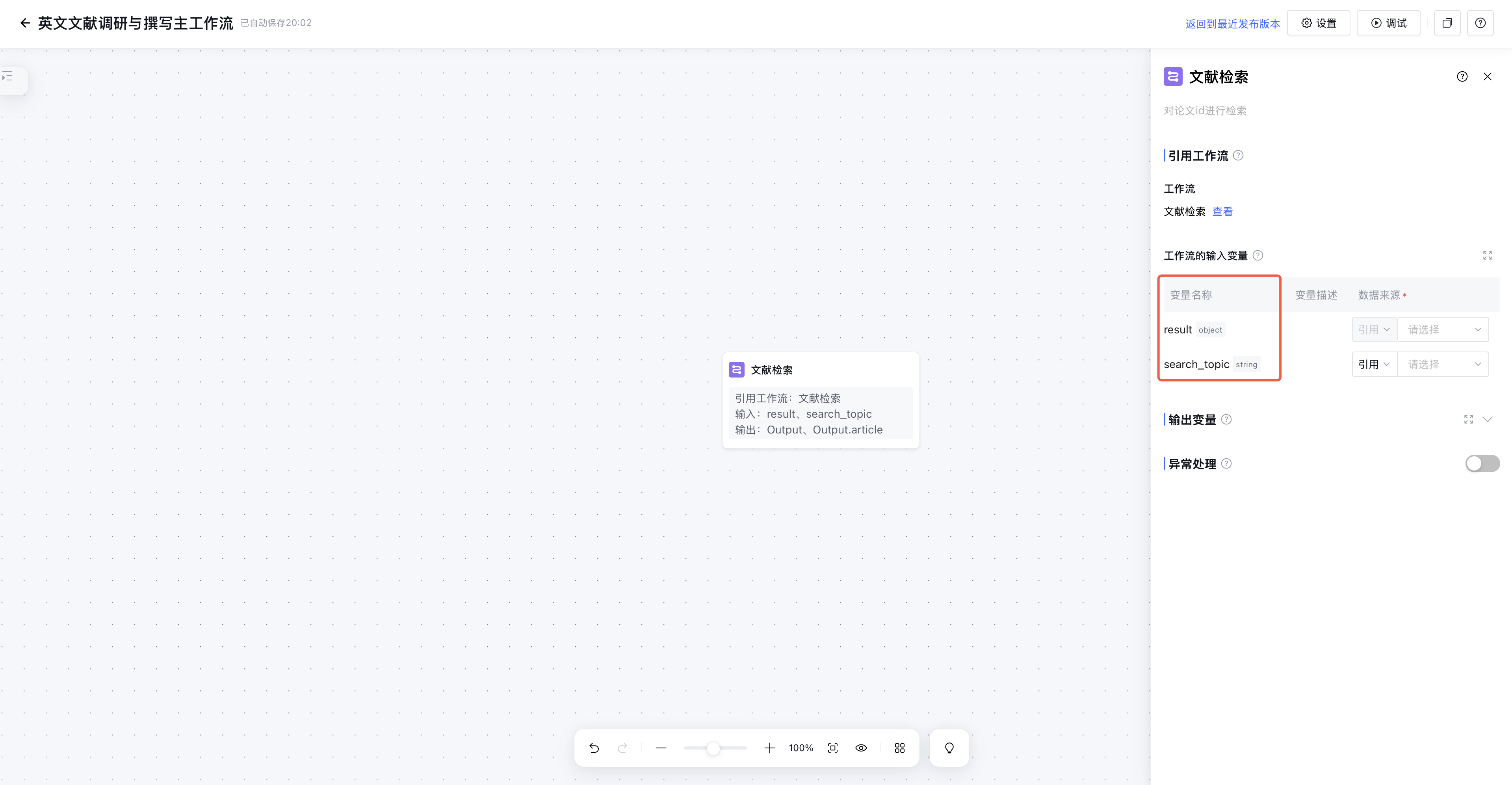 完成如上配置后,“文献检索”工作流中的变量即可被传递到其他工作流中(此处以“英文文献调研与撰写主工作流”为例)。