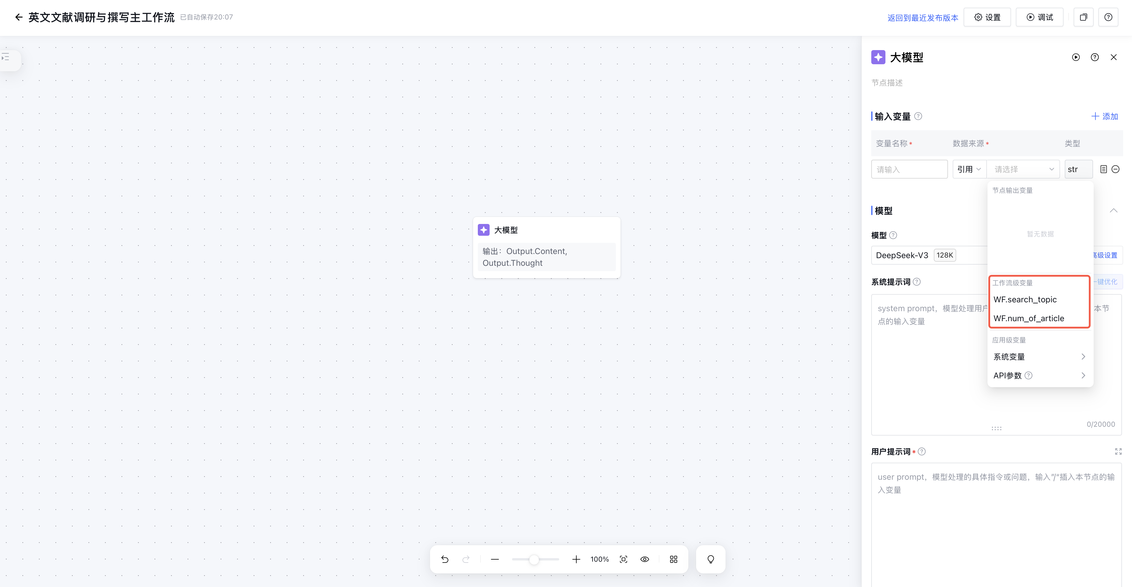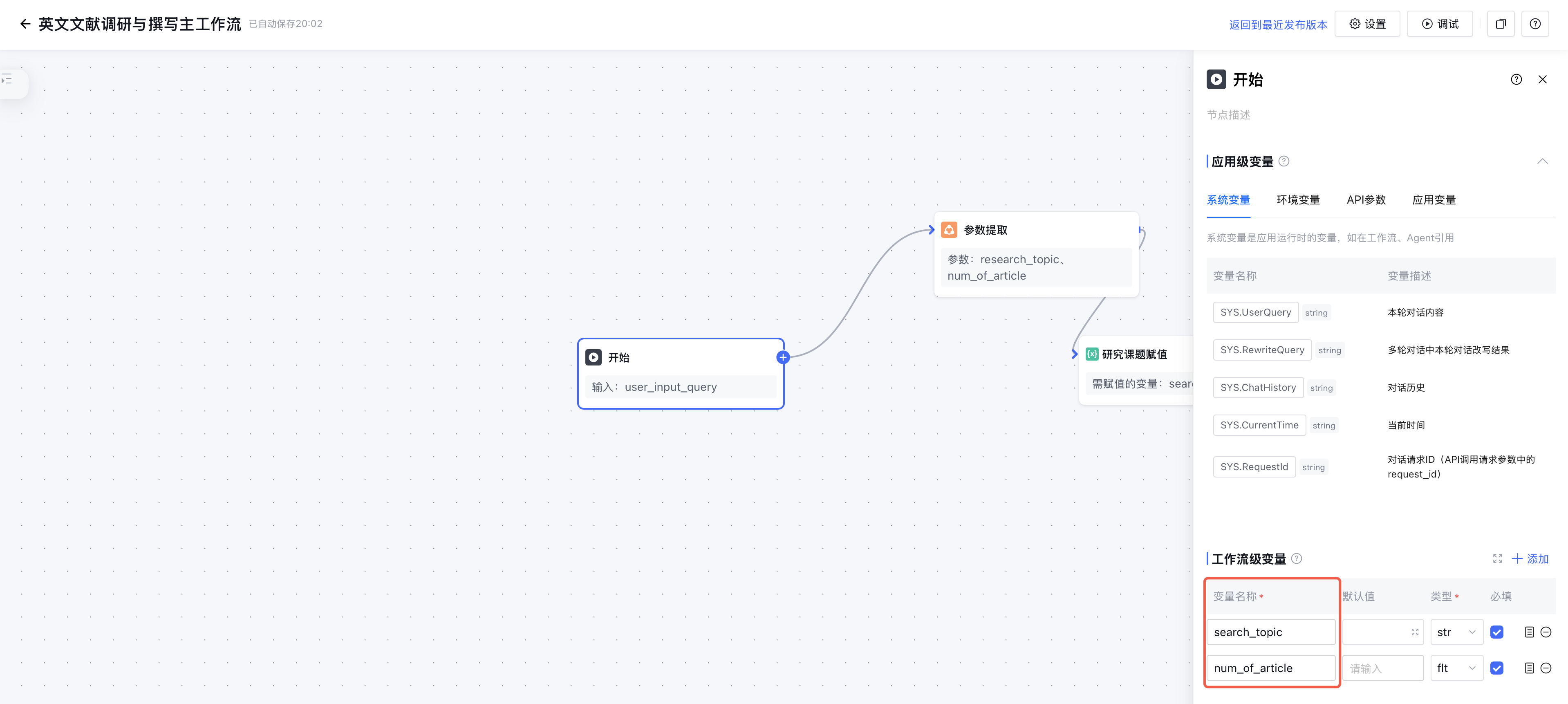 完成如上配置后,search_topic 和 num_of_article 变量即可在“英文文献调研与撰写主工作流”的各节点中被全局使用(即使节点间不存在直接连接关系)。