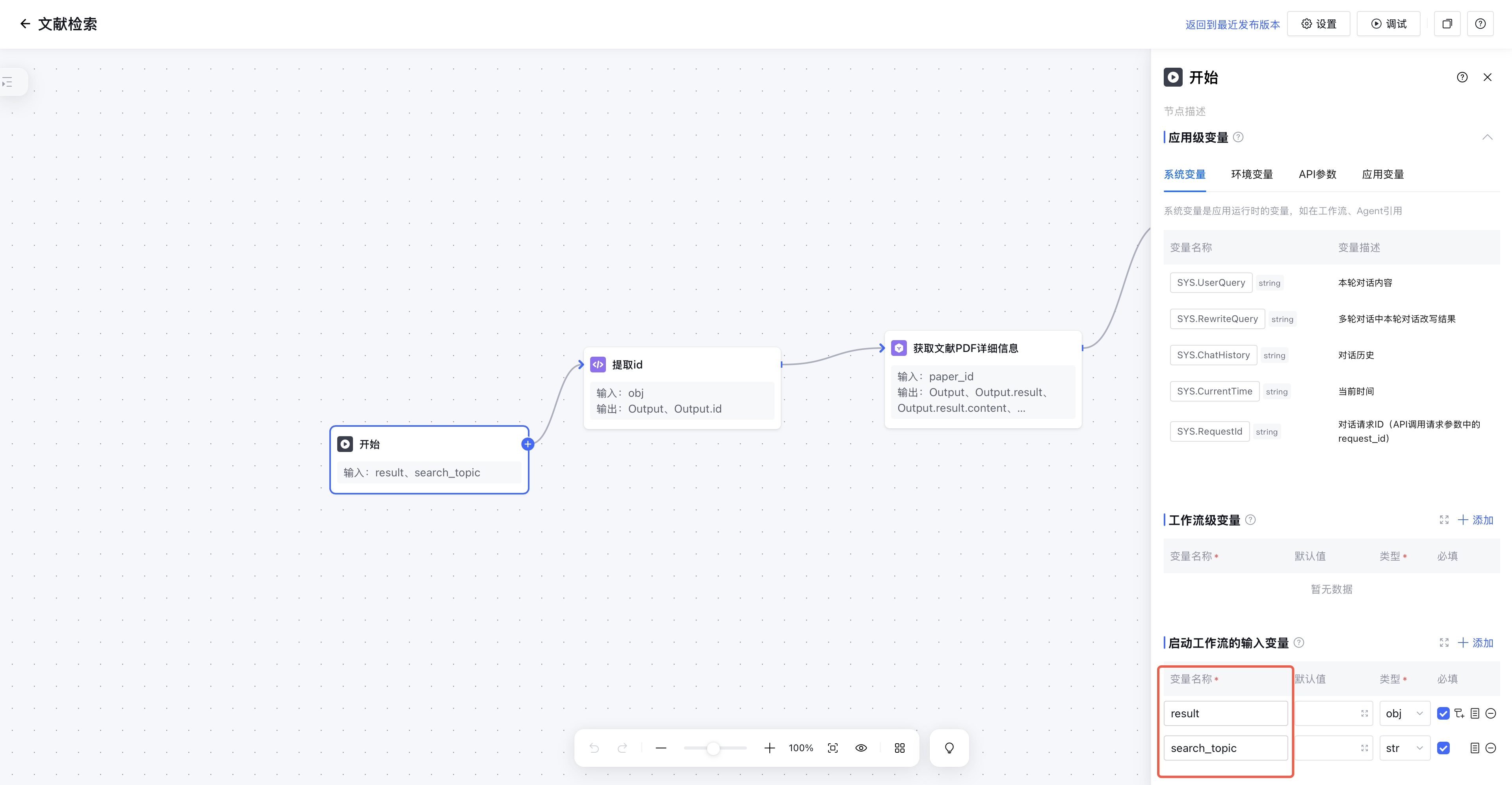 在“英文文献调研与撰写主工作流”中,调研主题(search_topic)和调研结果(result)变量需要被传递到“文献检索”工作流时,首先需要在“文献检索”工作流的开始节点添加对应的启动工作流的输入变量: