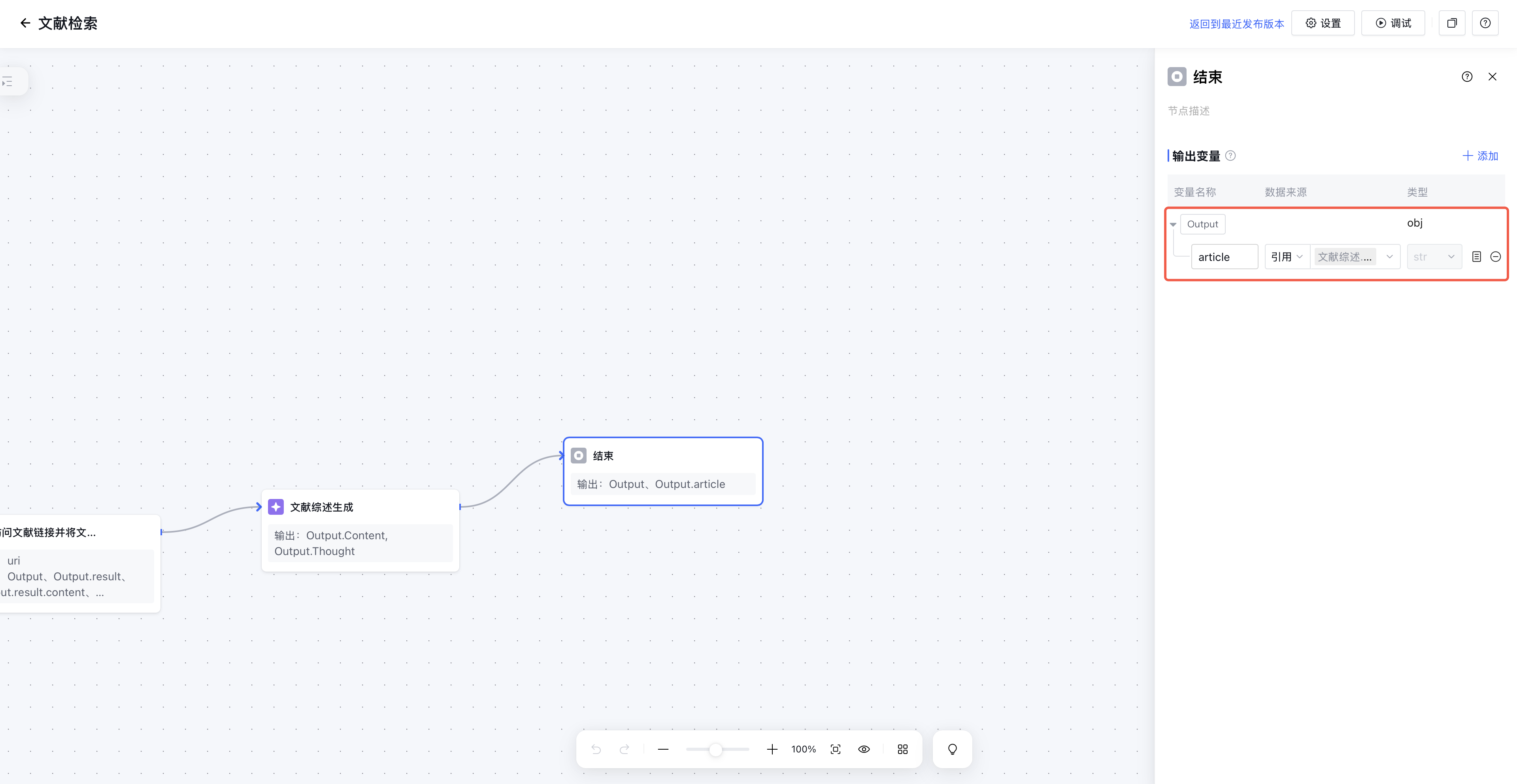 需要注意的是,当前工作流中的变量(此处以“文献检索”工作流的执行结果为例)需要传递到其他工作流时,需要在该工作流的结束节点进行输出变量的相关配置:
