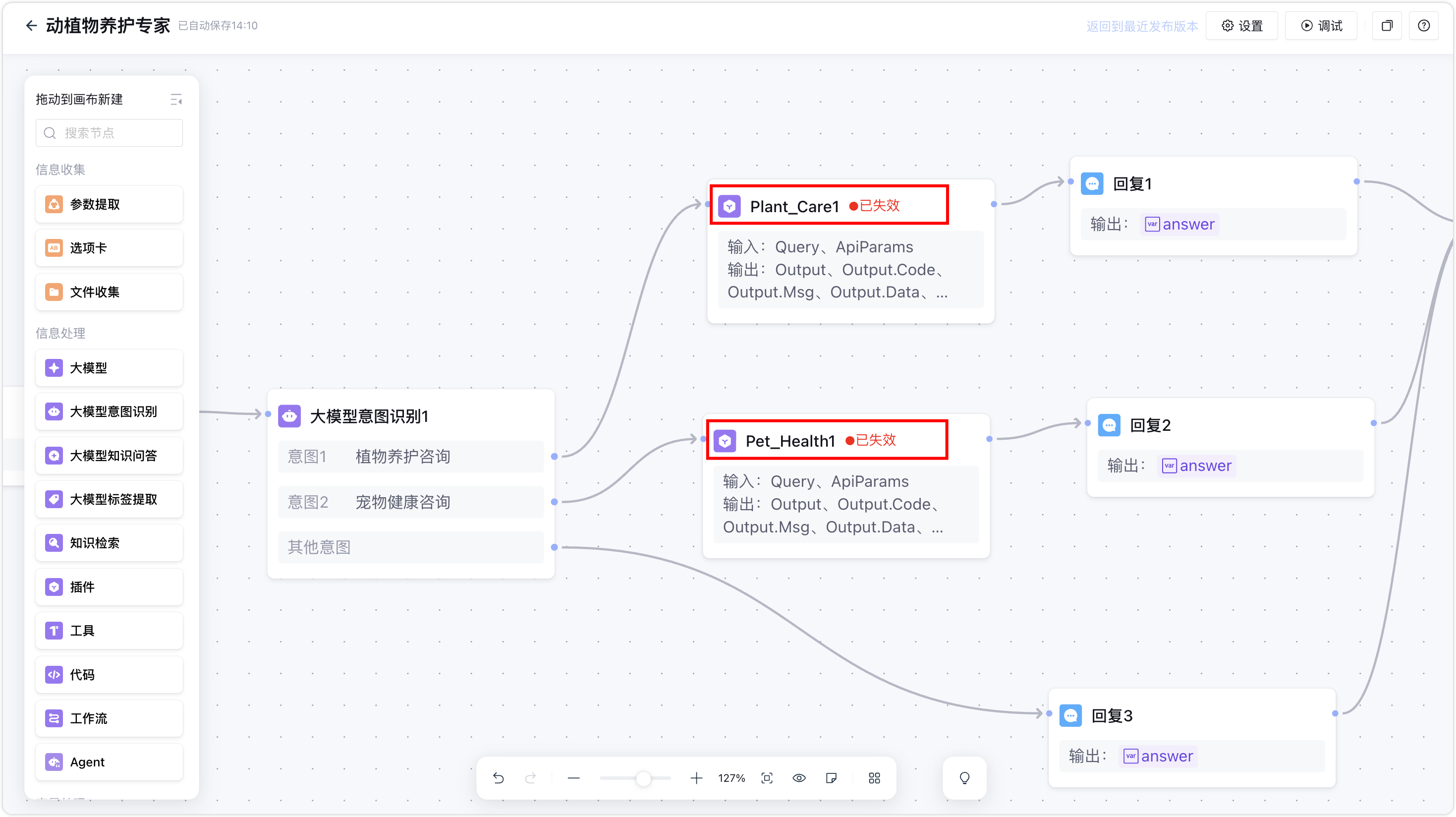 如果配置的工具中包含自定义插件,自定义插件删除后,工作流画布中对应的插件节点处会提示用户“已失效”。