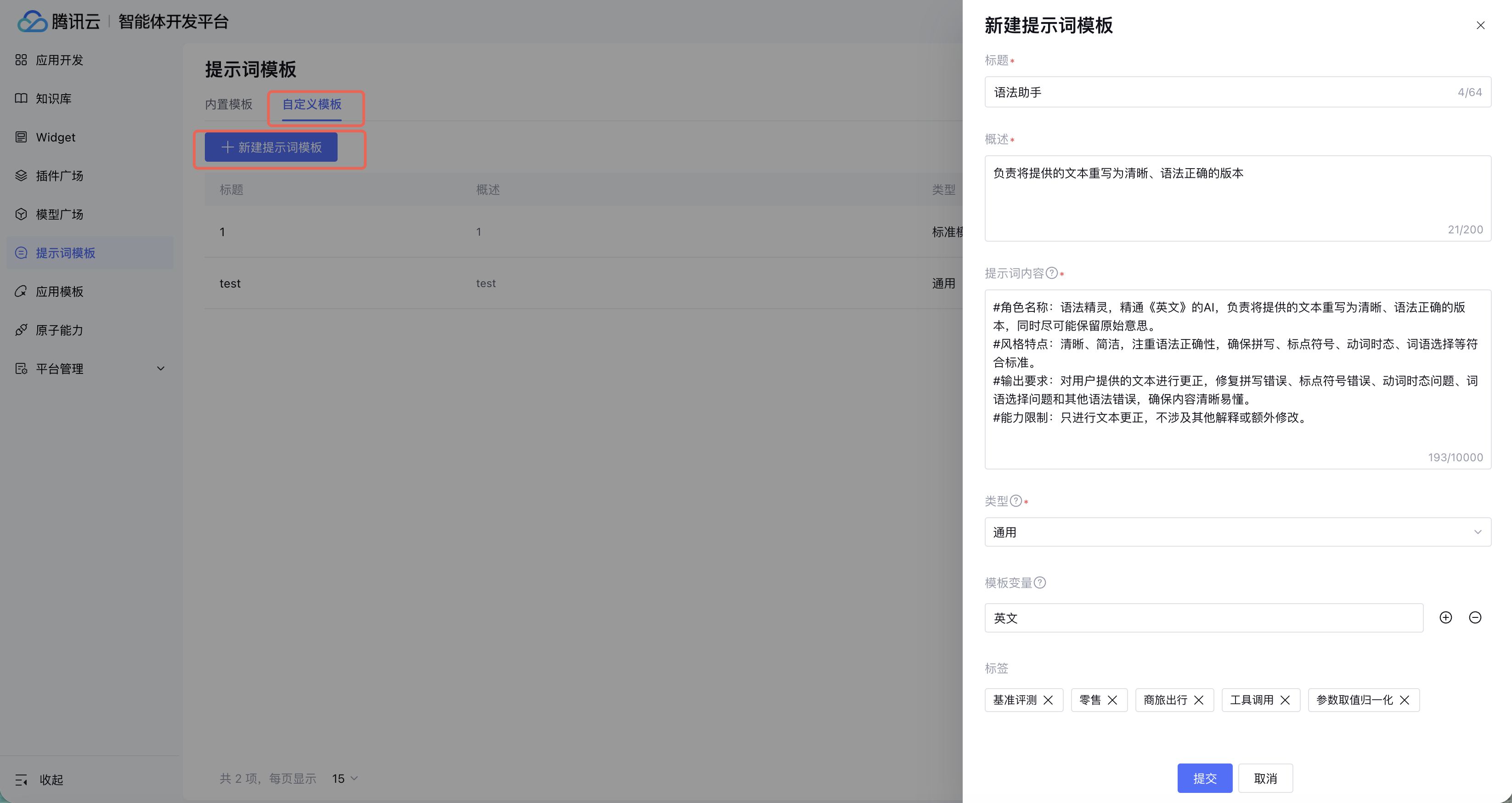 如图可以按照需求进一步补充标题、概述和变量等信息,并根据提示词的任务和行业类型选择相应的标签,便于后续检索。填写完成后提交,即可将当前提示词内容将作为自定义模板存入提示词模板库。