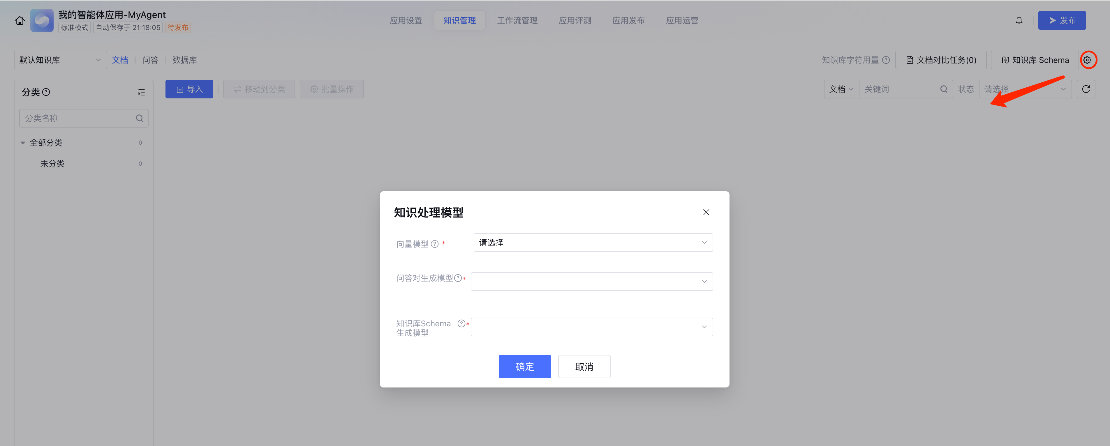 您可以通过设置按钮对标准模式应用知识库、知识库的知识处理模型进行统一设置。标准模式应用知识库、知识库支持设置向量模型、问答对生成模型、知识库Schema生成模型。您可以前往 模型广场 配置合适的模型,以满足不同业务场景下的需求。