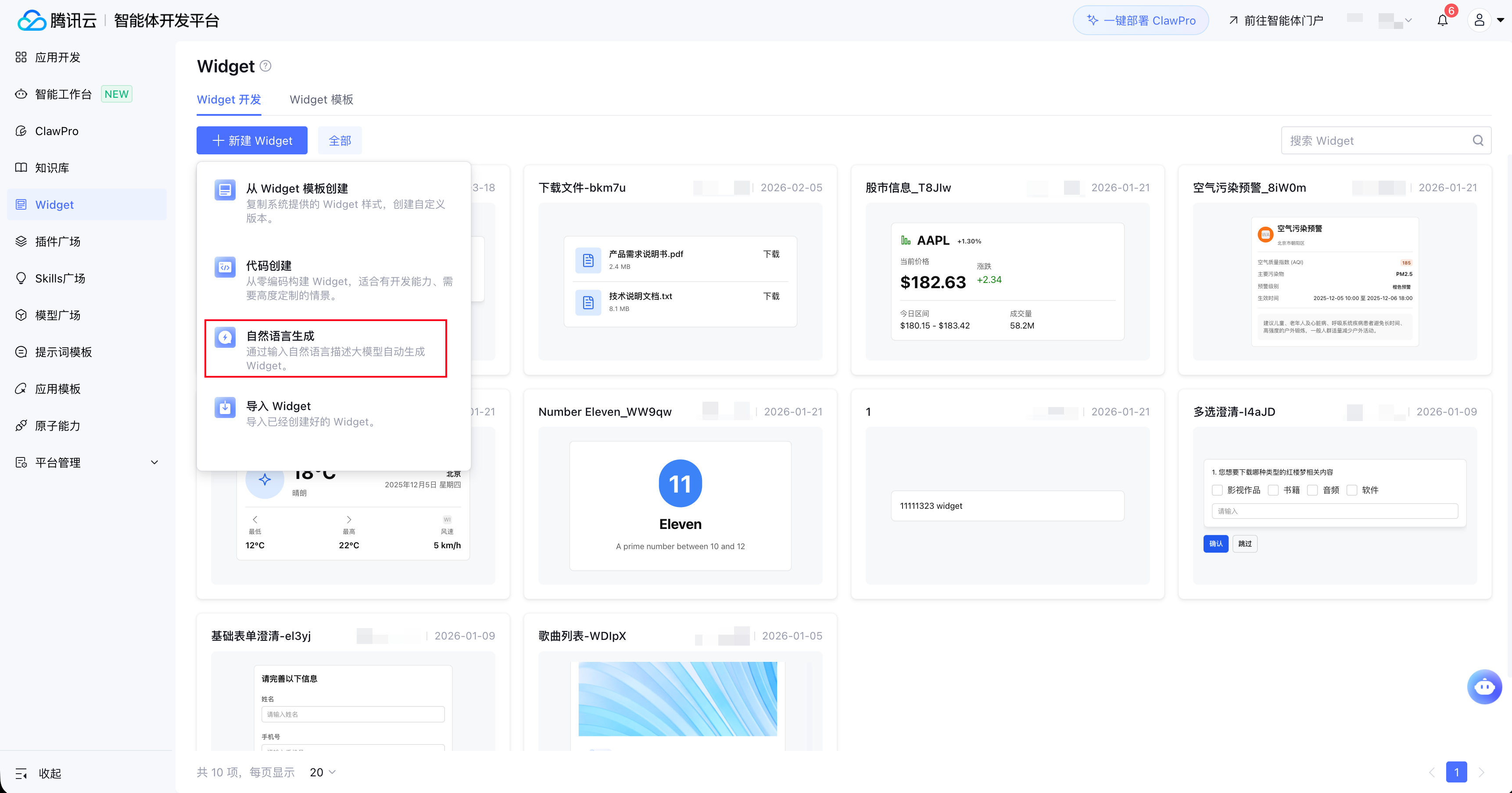 在 Widget 开发页面单击新建 Widget,选择自然语言生成。