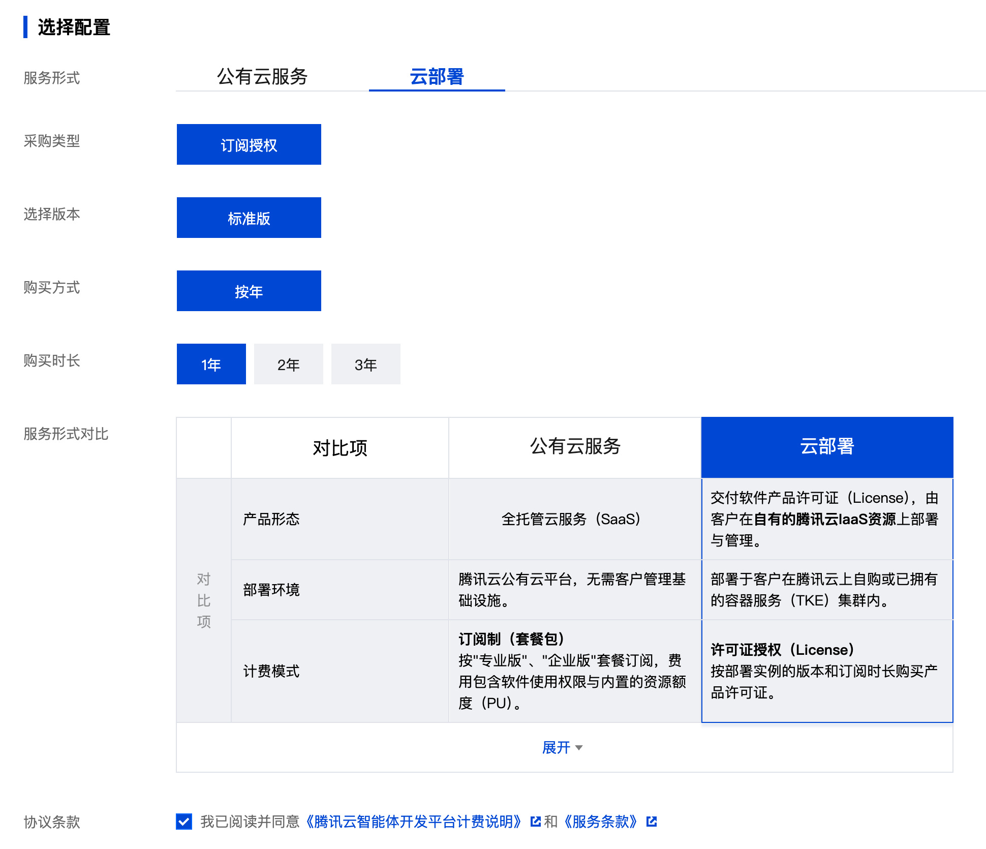 4.1 仔细阅读《腾讯云服务协议》等相关协议,确认无误后勾选同意。