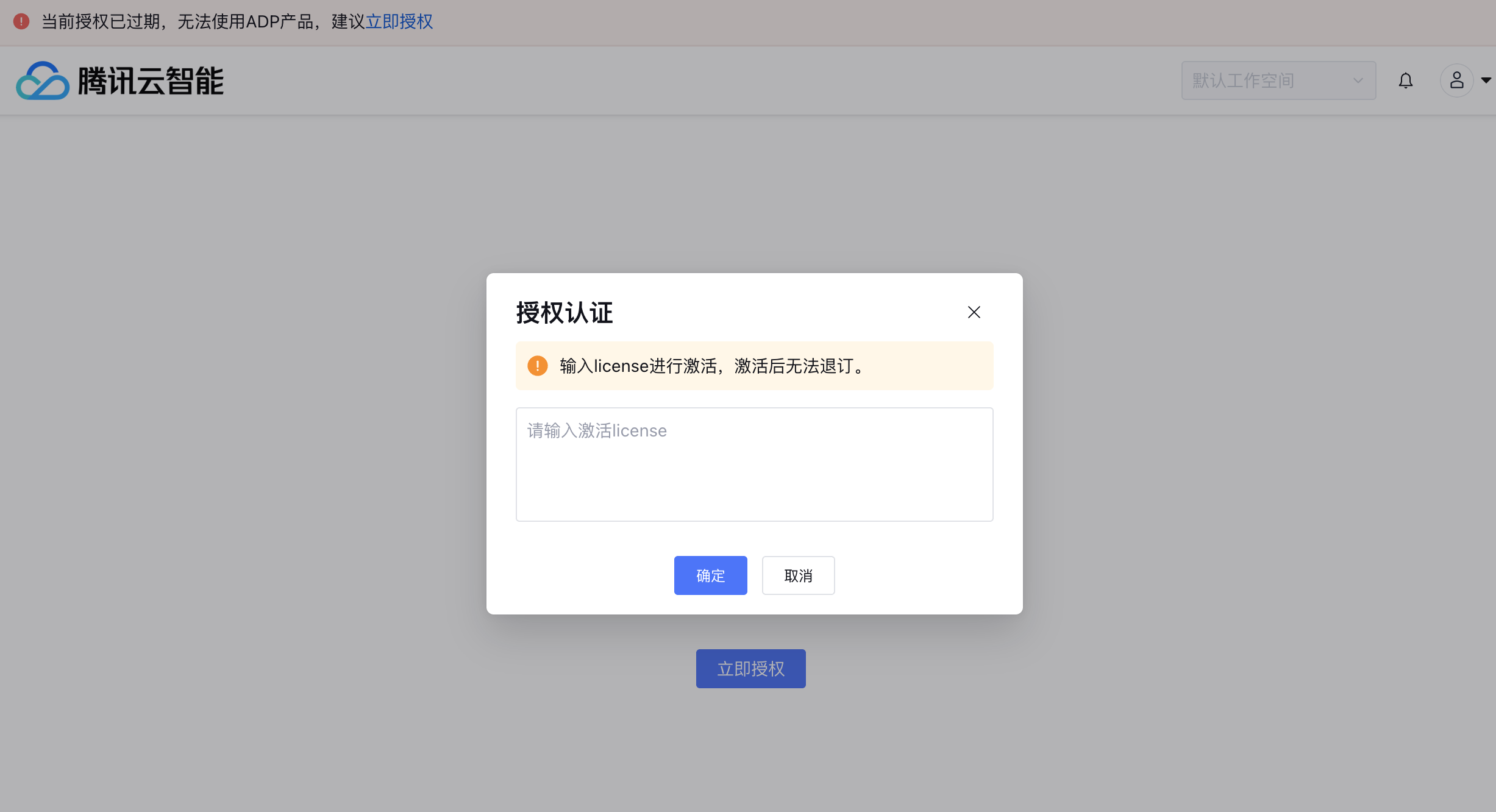 登录后,系统会提示您激活产品,请在“授权认证”框中填写授权文件中的 License(长字符串),单击确定激活Tencent Cloud ADP。