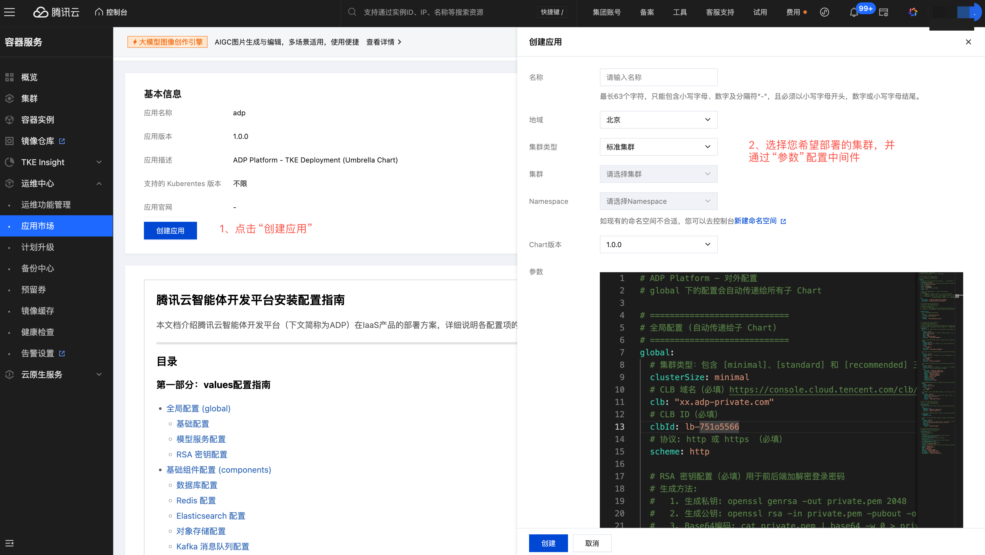 “参数”即集群部署时所使用的 values.yaml 文件,您可以在其中配置中间件以及模型服务地址等内容,详细配置方法请参考“adp”详情页中的 《腾讯云智能体开发平台安装配置指南》文档。