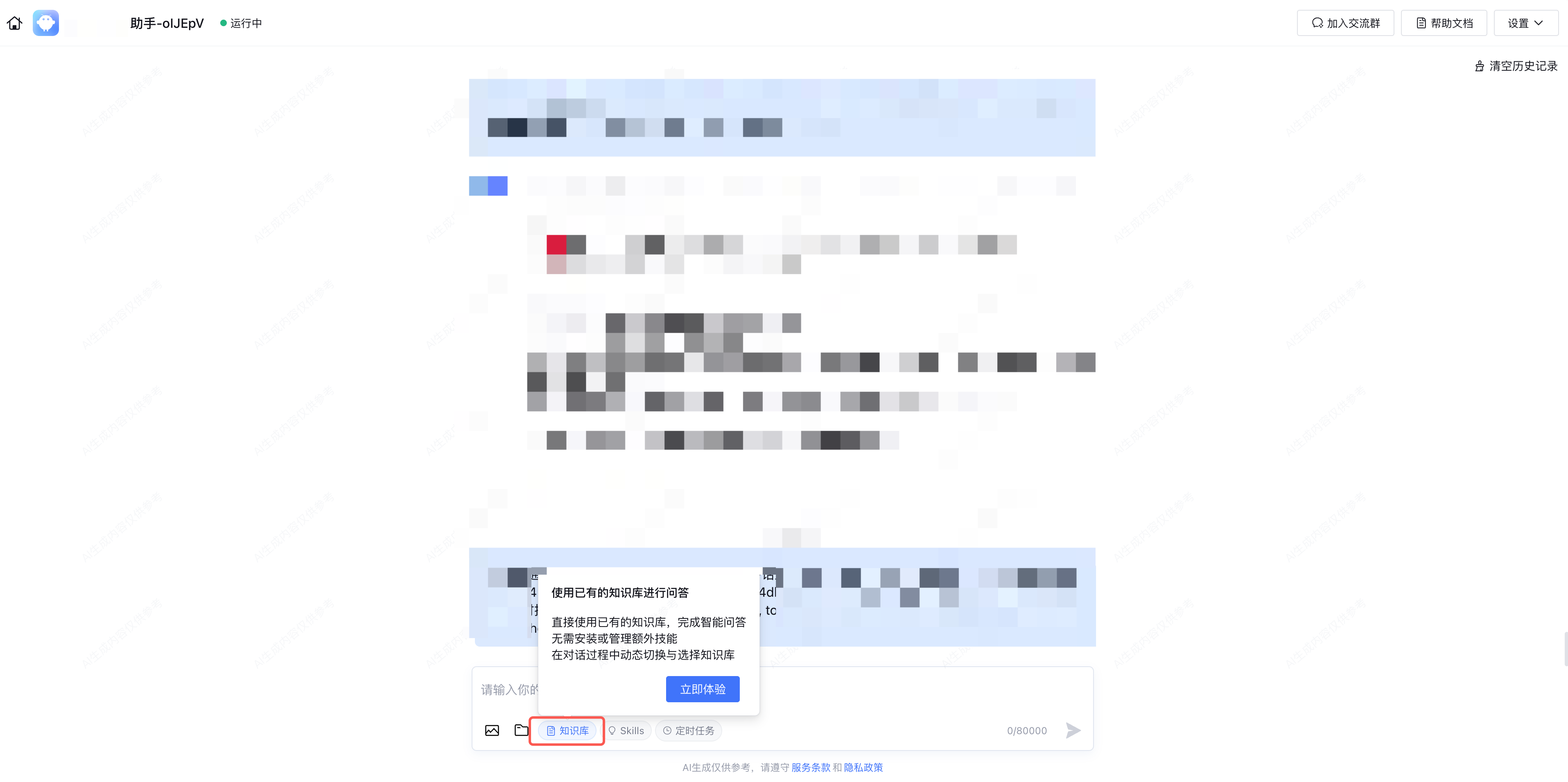 支持选择权限范围内的知识库进行对话,支持在智能体开发平台对话页面使用。