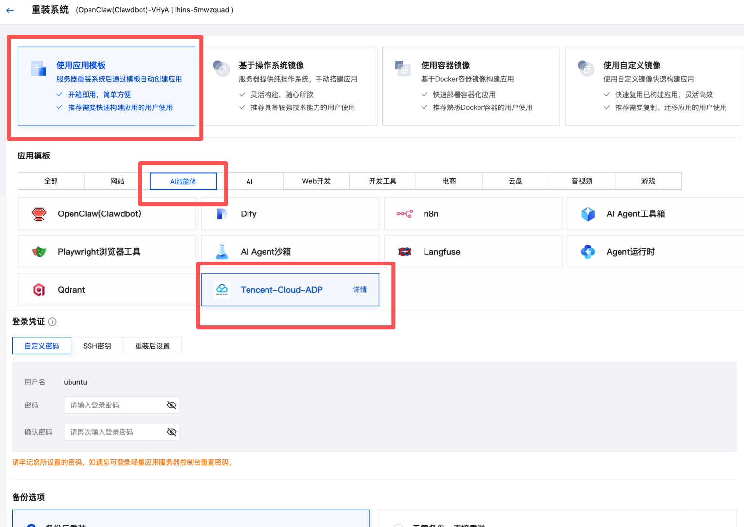 单击重装系统,您可重新选择部署方式及模板。选择“使用应用模板”的创建方式,并找到“ AI 智能体”版块的应用模板,单击 Tencent-Cloud-ADP。您可以重新设置登录凭证(密码或 SSH 密钥),并按需选择是否需要备份,阅读重装确认事项后,勾选确认已了解以上内容,单击确定。即可将原有服务更换为Tencent Cloud ADP 服务。