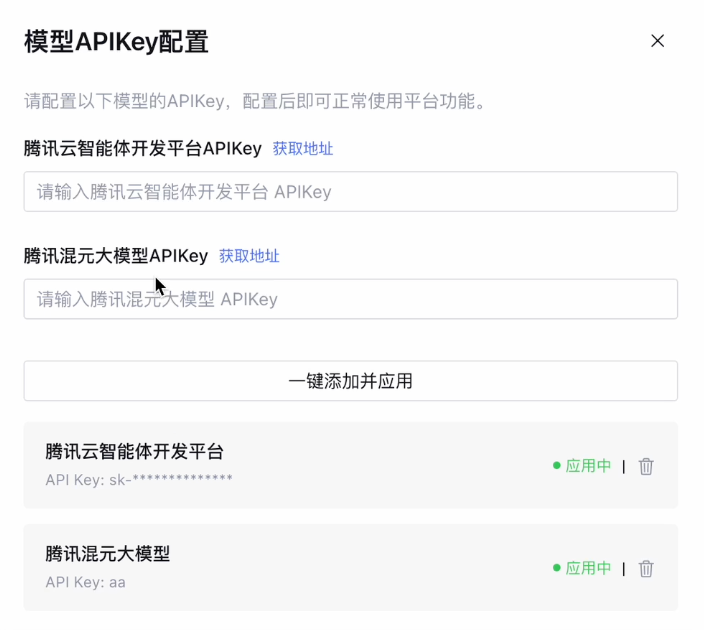 腾讯智能体开发平台 APIKey 用于获取腾讯云知识引擎原子能力的服务,您可通过多款原子能力组建您专属的模型服务,调用文档解析、拆分、embedding、多轮改写等服务进行组装,定制企业专属 AI 业务,详情请参见 知识引擎原子能力。