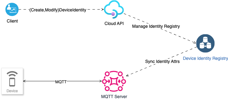 MQTT 为每个实例提供设备身份注册表,方便用户为具体设备/客户端提供附加配置,从而实现“一机一密”,“传播属性”等特性。设备身份注册表通过 CAPI 开放一组管理接口,实现设备身份的创建、更新、删除等管理。