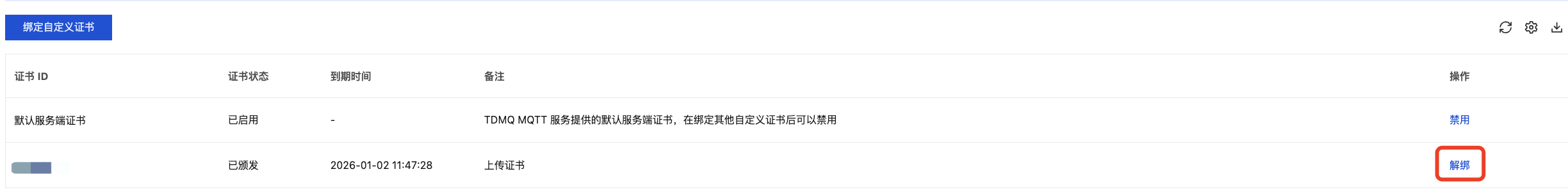 在绑定其他自定义证书后,可以禁用 TDMQ MQTT 版提供的默认服务端证书,具体步骤如下: