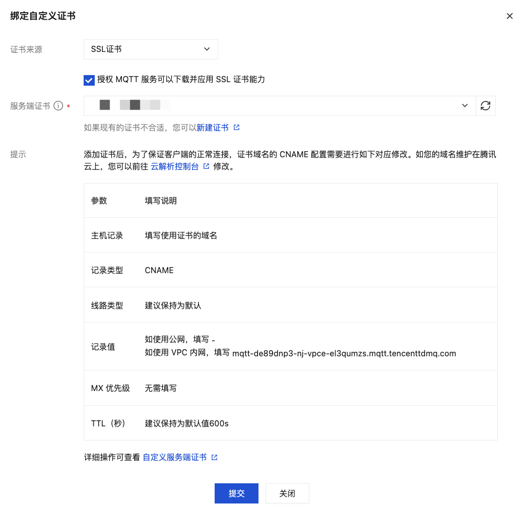 服务端证书:在下拉框中勾选托管到腾讯云的 SSL 证书。