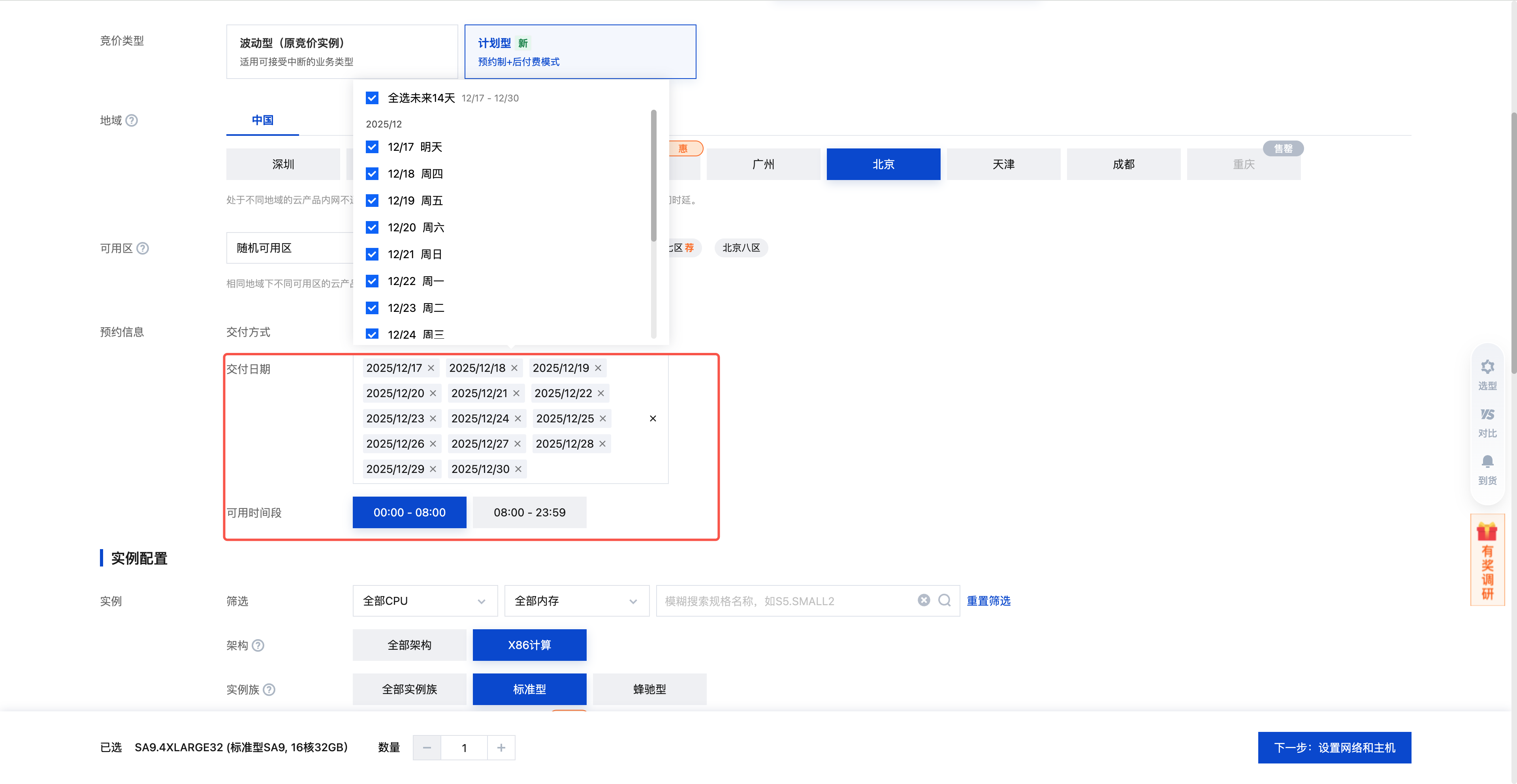 3. 选择地域、可用区、实例配置、网络的方式与其他计费模式相同,值得注意的是,您需要选择预约信息,包括交付日期和可用时间段,可用时间段开始前6小时停止预约,最多可预约未来14天的资源,如下图所示。