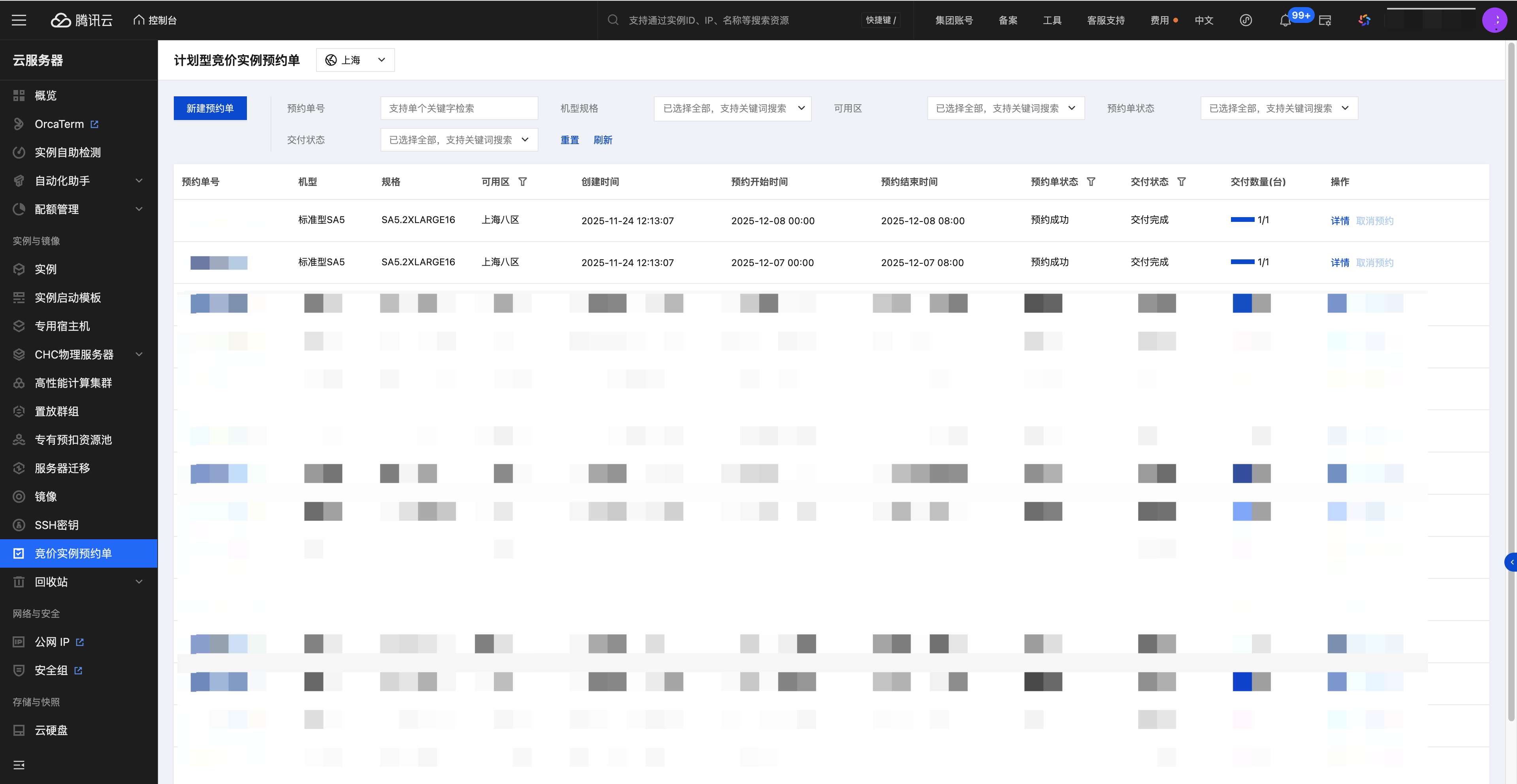 6. 在 竞价实例预约单 页面,可检索您的预约单,并查看预约单详情、预约单状态、交付状态和关联实例,也支持取消预约操作。