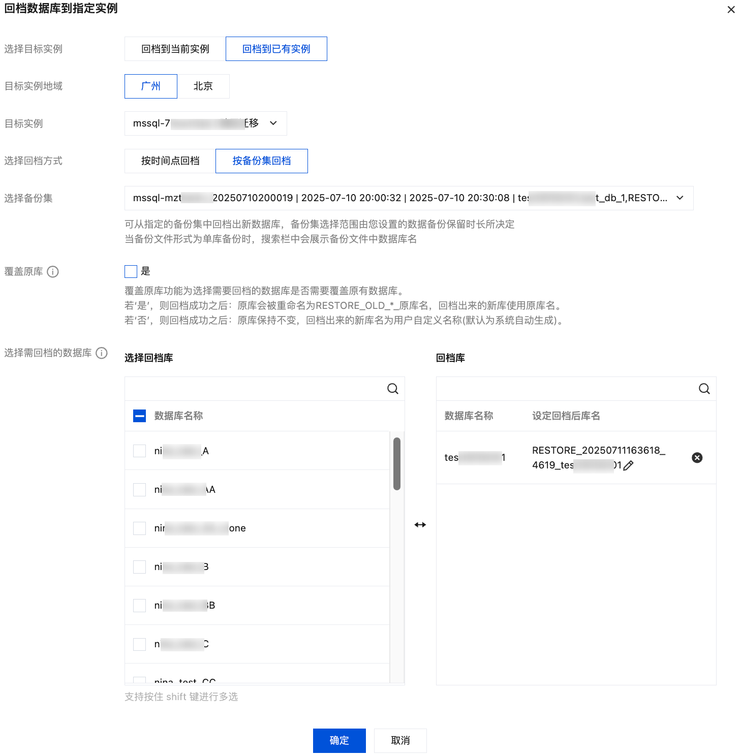 选择需回档的数据库 | 选择需回档的数据库,支持单库、多库、全选库进行回档,支持搜索库名快捷筛选,若不覆盖原库,则选中的库可在右侧回档库下进行重命名,若未进行重命名,则回档出来的新库名默认为系统自动生成,名称形式为前缀加原库名,回档后库名仅支持“字母”/“数字”/“_”/“-”,以字母开头,最多128个字符。若覆盖原库,则无需在右侧回档库下重命名。 |