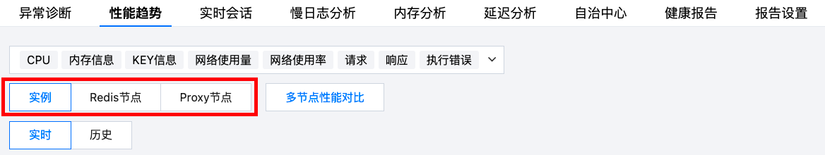 Redis 节点:支持查看单节点的监控指标,也支持展示节点间各指标的趋势对比查看。多 Redis 节点性能趋势对比查看请参见 多节点性能对比。