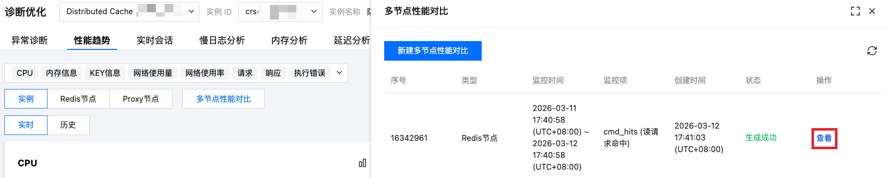 目前仅支持对监控维度为 Redis 节点的多节点性能指标对比。