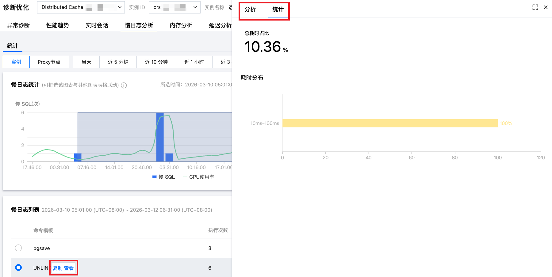 Distributed Cache 的慢日志分析与 MySQL 和 TDSQL-C 不同,Distributed Cache 慢日志分别统计了实例与 Proxy 两个维度的慢日志。