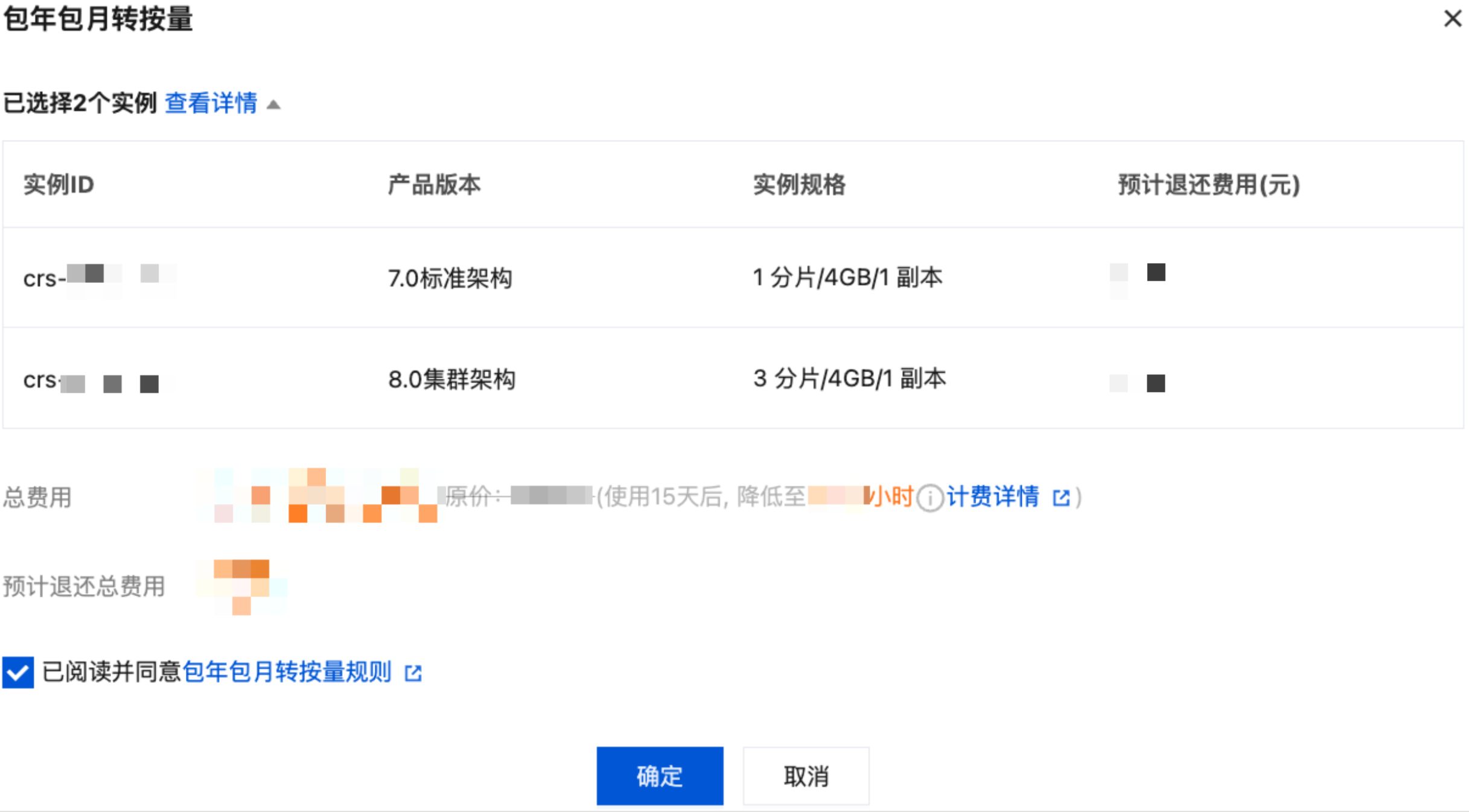 单击查看详情,核对需要转换的实例详情,包含:实例 ID、版本、规格及退还费用。