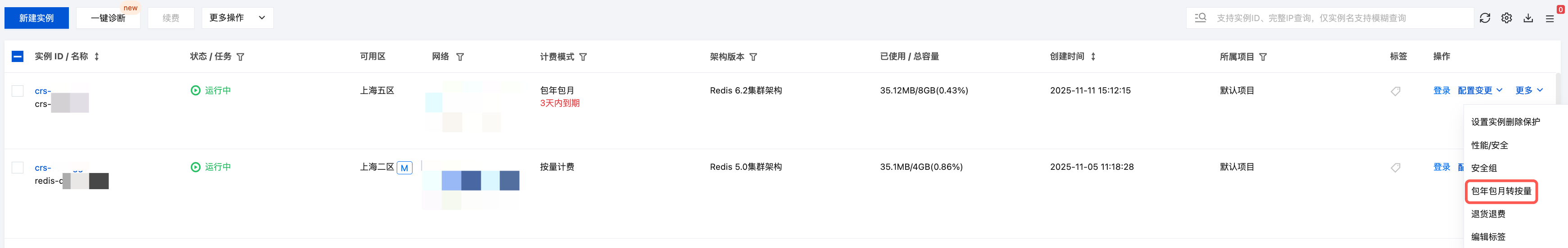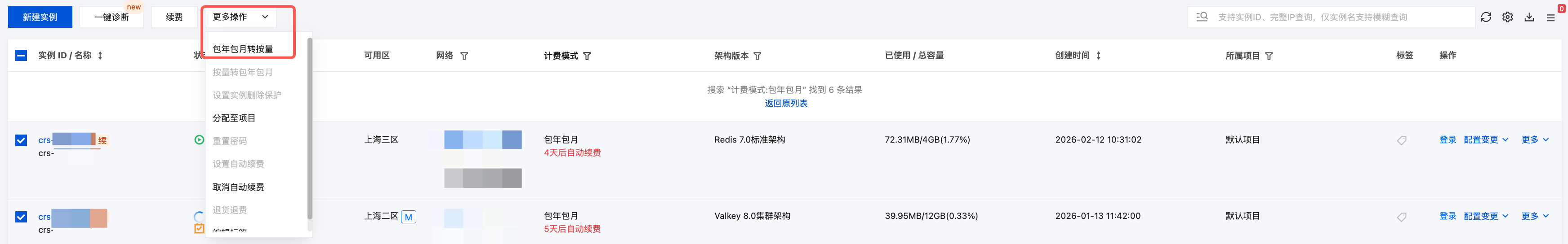 3. 在实例列表中,根据实际需求,选择对应操作将包年包月实例转换为按量计费: