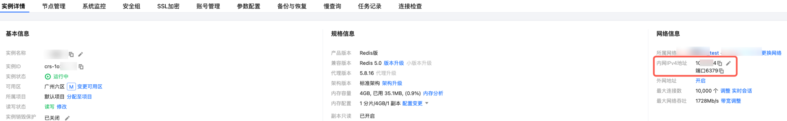 登录 腾讯云分布式缓存数据库控制台,在实例列表的网络列,可查看到为实例分配的内网 IPv4 地址。