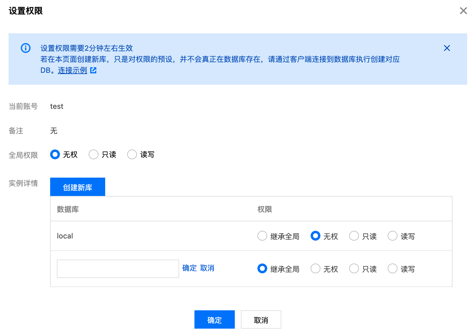 7. (可选)确定需查看的账号,单击其操作列的查看/设置,可在设置权限窗口,查看或修改该账号的读写权限及其在各数据库的访问权限。如下图所示,在此界面中单击创建新库,可直接为当前账号创建新数据库并设置其访问权限。
