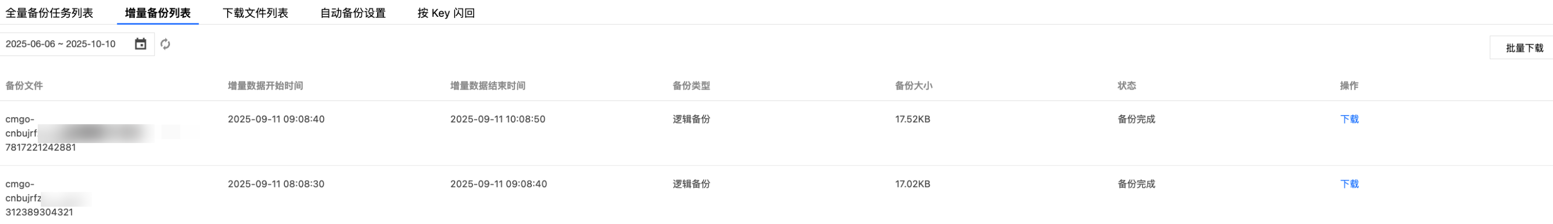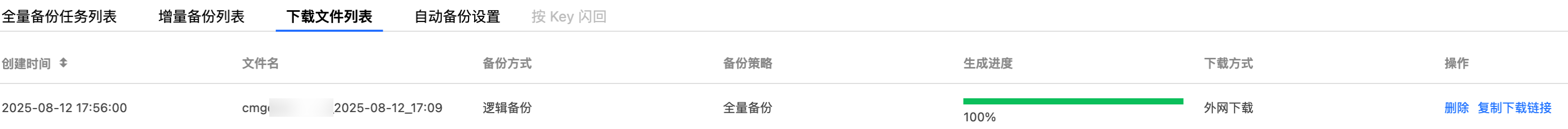 8. 切换至下载文件列表页签,可看到已生成的备份文件列表。在操作列,单击复制下载链接,可在浏览器使用复制的链接直接下载备份文件。
