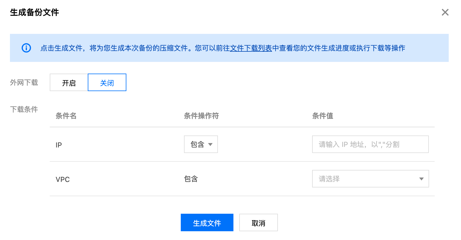 7. 在备份文件列表,单击操作列的下载。在生成备份文件的小窗口,设置生成备份文件的条件。
