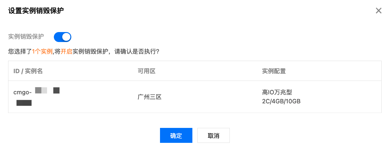 5. 在设置实例销毁保护的小窗口,确认开启销毁保护的实例信息,单击确定。