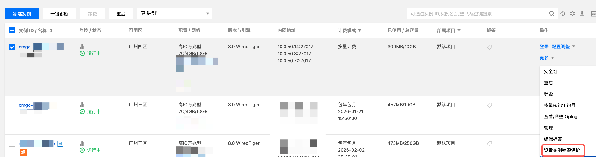 MongoDB 实例销毁保护是一项安全防护功能,专门用于防止用户在操作过程中意外销毁重要的数据库实例。启用销毁保护后,用户将无法通过控制台及 API 销毁实例,为承载关键业务数据的 MongoDB 数据库提供可靠的安全保障。当业务确认需要清理实例时,用户必须先主动关闭销毁保护功能,再执行实例删除操作。