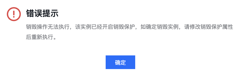 6. 开启后,在执行实例退还或者销毁操作时,提示如下错误提示。若确认退订实例,需先关闭实例销毁保护功能,再执行实例退还或者销毁操作。