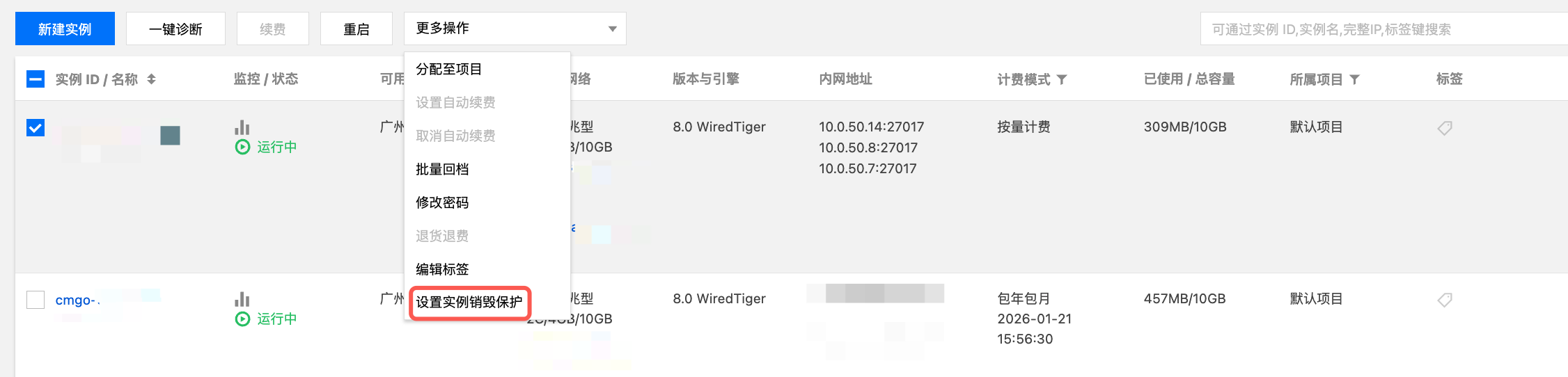 批量开启:在实例列表,勾选需开启销毁保护的实例,在实例列表上方,选择更多操作 > 设置实例销毁保护,如下图所示。
