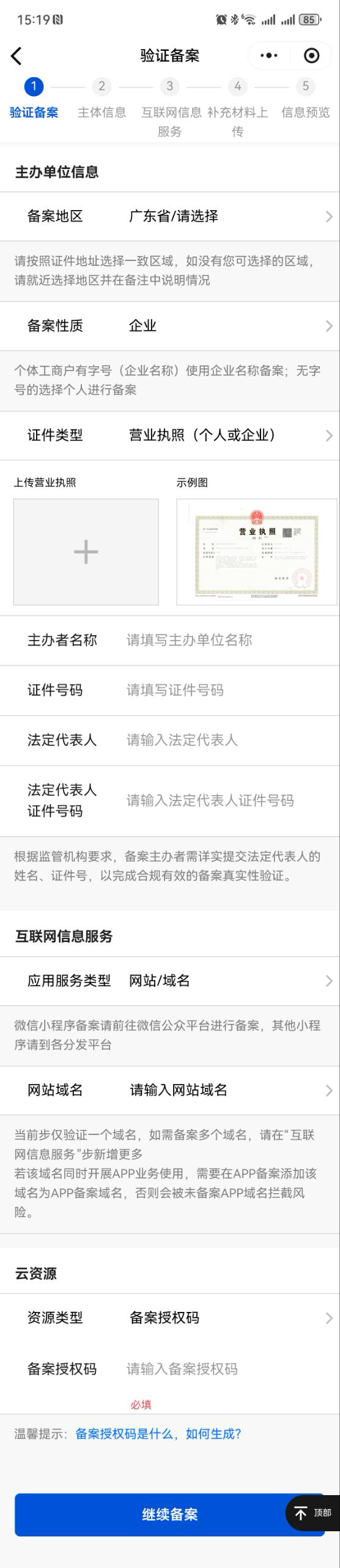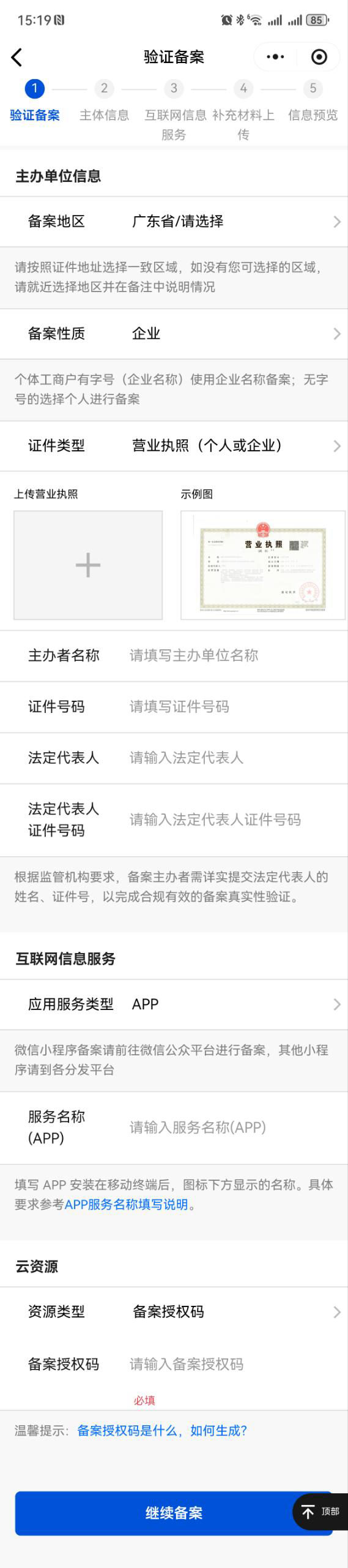 4. 完成基础信息填写后,单击继续备案,进入主体信息步骤。
