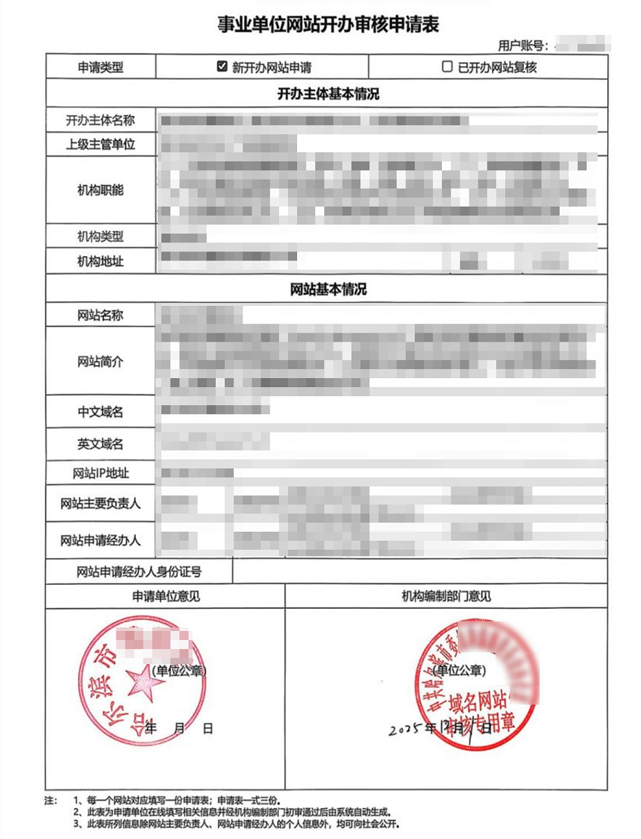 2. 事业单位或者党政机关特殊要求:党政机关、事业单位开办网站服务需得到同级机构编制管理部门批复的《网站开办资格申请表》,并将此 “申请表 ”同其他备案材料一并提供给接入服务企业申请网站备案,具体请参考 操作指引流程,用户按照指引填写申请,等待审核,审核通过后,下载申请表即可。后续在备案服务商进行备案时,需要将《网站开办资格申请表》上传在补充材料位置,参考材料如下: