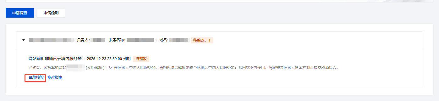 在自查准备弹窗中,提交您对应有解析的域名信息进行复查。