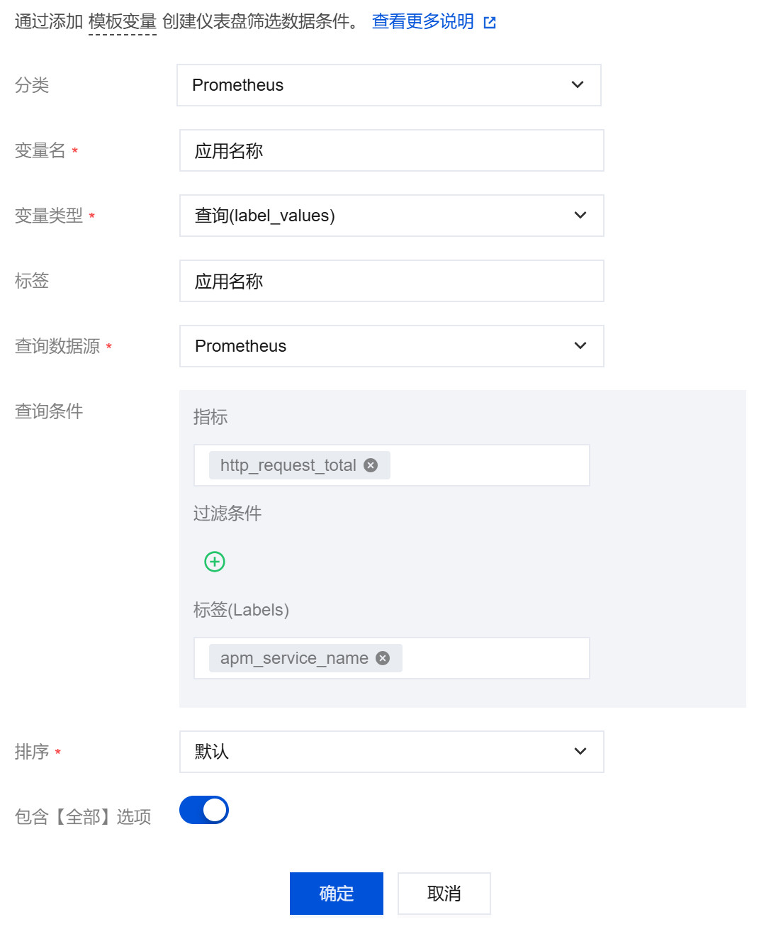 apm_service_name,变量类型设置为查询(label_values),查询条件中包含唯一的标签 apm_service_name。